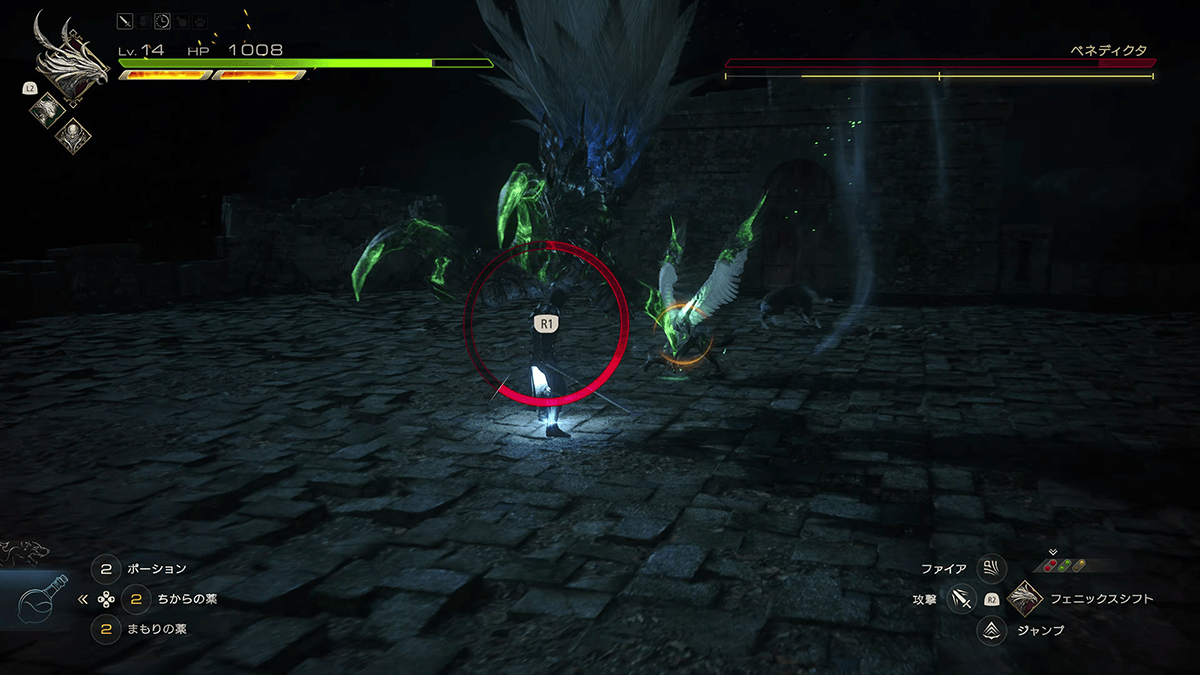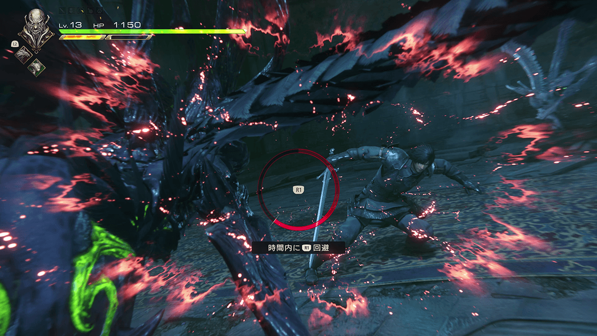 砦内部の礼拝堂では、ベネディクタが仕向けたチラーダ&スパルナとの戦闘に。この中ボス戦ではクイック・タイム・イベント的なボタン入力演出が発生。ゲージ表示中にR1ボタンを入力して敵の滑空攻撃を回避し、続けざまにゲージ表示中に□ボタンを入力して敵を斬り落とす。迫力のカメラワークで見せる演出は、最高にかっこいい! ちなみに、ボタン入力の時間的な猶予はかなりあった。