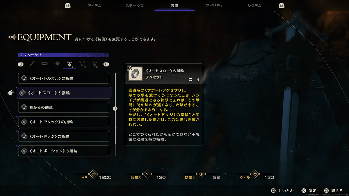 今回のプレイではストーリーフォーカスモードが適用されており、サポートアクセサリ「《オートスロー》の指輪」「《オートトルガル》の指輪」が装備されていたほか、「《オートアタック》の指輪」「《オートドッジ》の指輪」「《オートポーション》の指輪」も所持している。これらがどの程度サポートしてくれるのか、まずは試してみることにした。