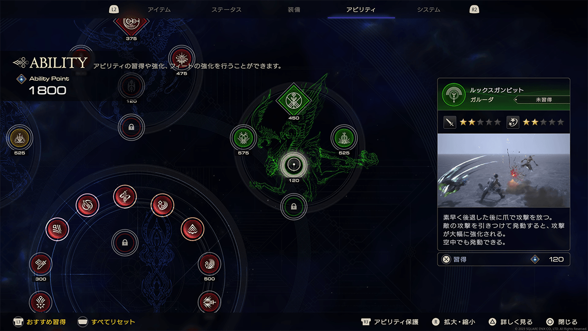 クライヴの召喚獣アビリティは、召喚獣ごとにかなりの数を用意しています。どのアクションを習得するのか、どのアクションを鍛えていくのかは、プレイヤーの皆さん自身でカスタマイズ・強化することが可能です。召喚獣を手に入れるごとに能力の拡張が行なわれ、かつ多数の召喚獣アクションを習得・強化できます。