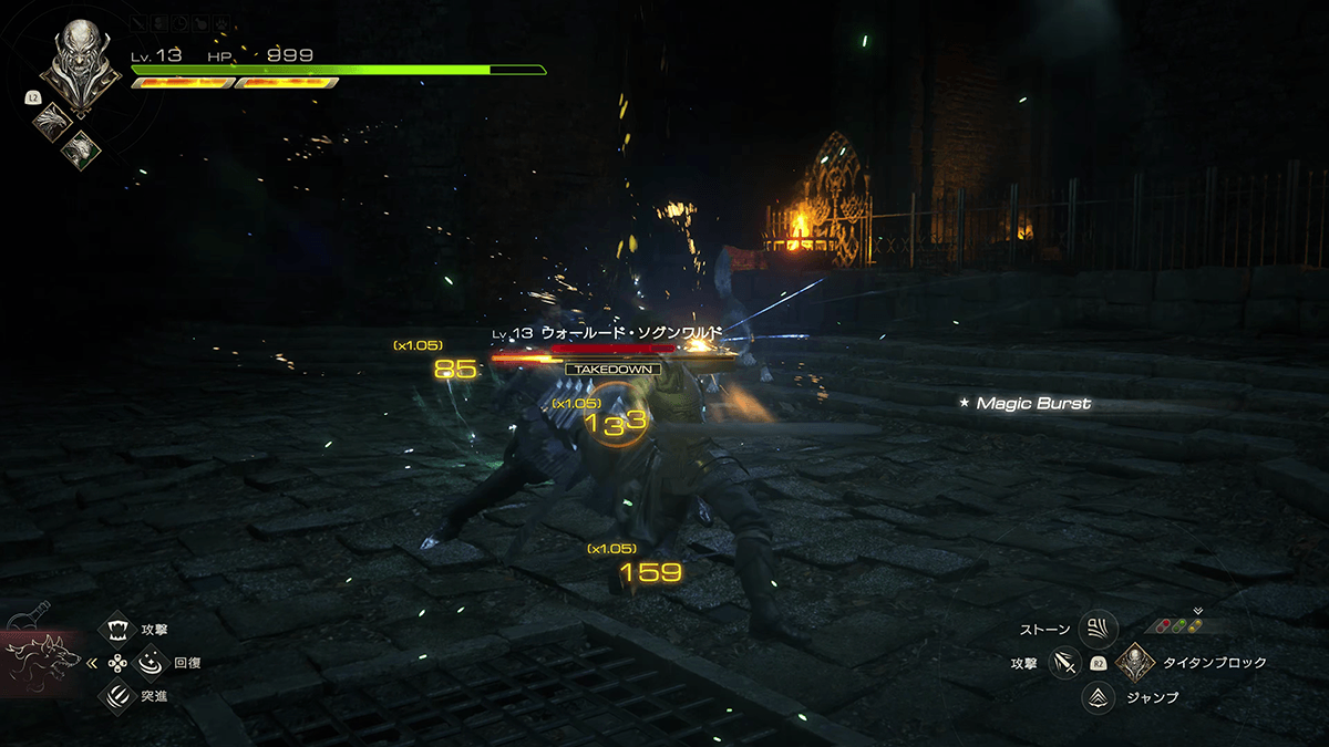 また、一部の敵にはHPゲージとは別にウィルゲージがあり、攻撃を加えてウィルゲージを削りきるとテイクダウンを取れる。テイクダウン中は敵の動きが止まり、与えるダメージが最大1.5倍にアップするため、敵のHPを大きく減らすチャンスだ。