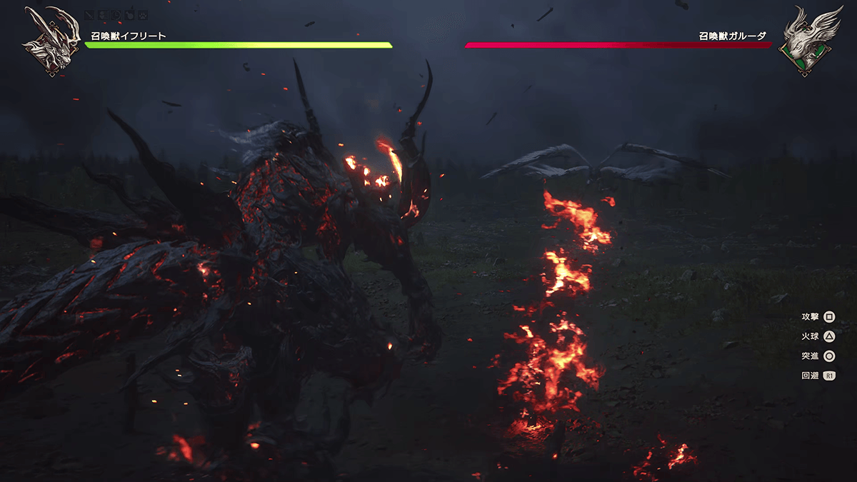 イフリートの攻撃方法は、殴る、火球を放つ、突進するという3種類が基本。巨大サイズゆえに重厚感のある動きになっているが、突進や回避では驚くほどの俊敏さを見せ、重いのに速いという野性的な力強さは、操作しながらワクワクしてしまう。さらに、空中に浮く巨岩を飛び移りながらガルーダを捕らえたり、吹き飛ばされた腕が瞬時に再生したり、マウントパンチで殴り倒したりと、イフリートの超パワーをひたすら見せつけられるのがまた楽しい。