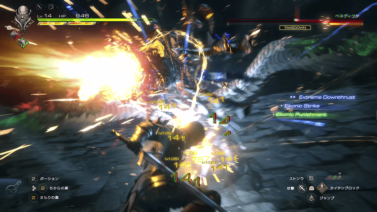 鈴木:『FINAL FANTASY XVI』は召喚獣をフィーチャーした作品になっているので、アクションパートも召喚獣の能力を軸としたバトルデザインにしています。ストーリーを進めていく過程で、さまざまな召喚獣の力を習得していきますので、習得したそれぞれの召喚獣の力を使って戦闘を行なった時に戦術が大きく変化するようにしました。今回の試遊会のバージョンでは、フェニックスとガルーダとタイタンを公開させていただきましたが、例えばガルーダであれば「アクションの操作における手先の器用さが召喚獣の強さに反映される」形としていて、タイタンは「ユーザーの反射神経が召喚獣の強さに反映される」形としています。それぞれの召喚獣に異なるコンセプトを設けています。ストーリーを進めていき、新しい召喚獣の力を習得するたびに、新しい遊びが提供されます。