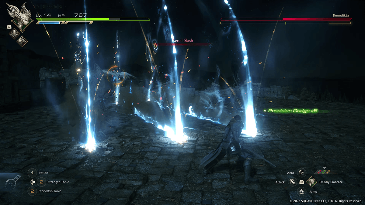「オートドッジ」も試してみたところ、こちらは操作をなにもしなくても自動で回避してくれる。クライヴの攻撃モーション中など回避できないタイミングもあるようだが、倒されるまで被弾を続けることはなさそう。アクションが本当に苦手なプレイヤーでも、バトルに勝てないストレスとは無縁になるだろう。また、「オートポーション」はクライヴのHPが一定以下になったとき、所持しているポーションを自動的に使用してくれるものだが、「オートドッジ」を装備しているなら「オートポーション」に装備枠を割く必要はないかもしれない。