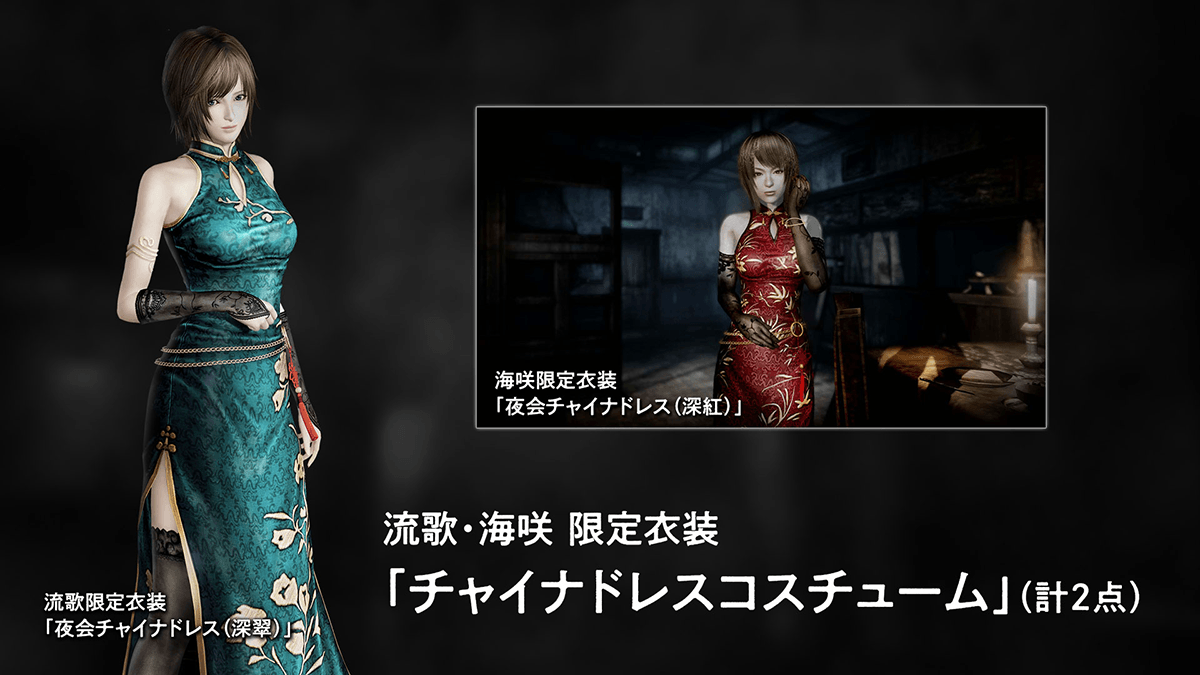 「朧月島の夜宴コスチュームセット」には、新規追加された衣装とアクセサリを多数収録。流歌・海咲・長四郎限定衣装「水着コスチューム」(計3点)、流歌・海咲限定衣装「チャイナドレスコスチューム」(計2点)、流歌・海咲限定衣装「ナイトウェアコスチューム」(計2点)、そして「アクセサリ」(計6点)が含まれる。