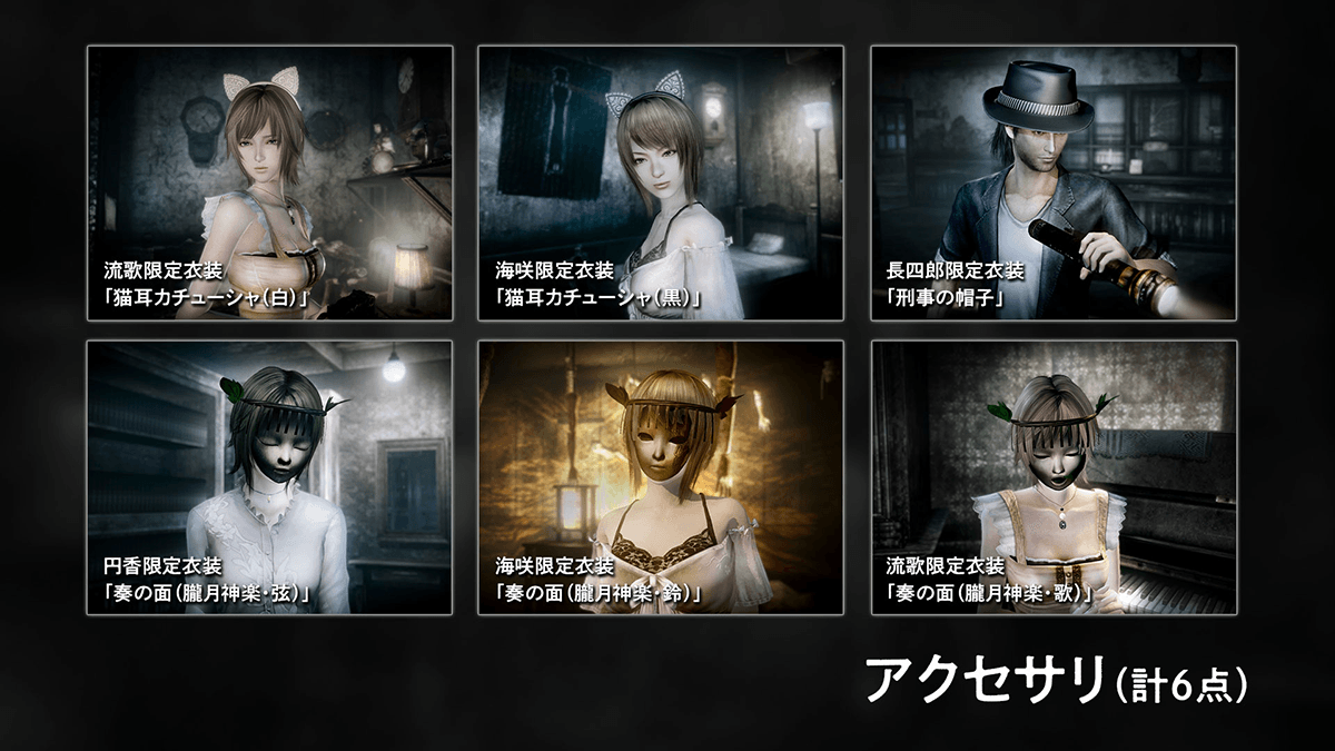 『零 ~濡鴉ノ巫女~』リマスター版のセーブデータで、流歌・海咲・長四郎限定衣装「射影機の被り物」が手に入る!