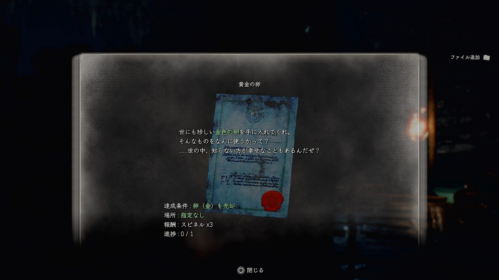 また、本作には「青い依頼書」というサブクエストが用意されている。その内容は「指定されたアイテムの売却」「指定されたエリアにある青いメダリオンの破壊」など、依頼書によってさまざま。依頼をこなすと報酬が手に入ることもあり、より美しく、そして恐ろしくなった舞台をすみずみまで探索するモチベーションの一助となっている。