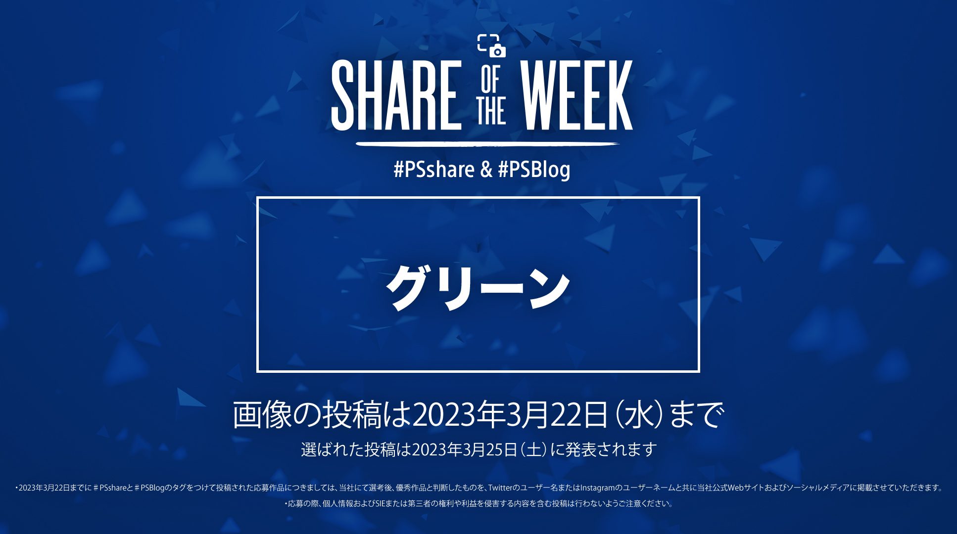 次週のテーマは「グリーン」! 自然や連想するキャラクターなど! お気に入りのゲームに登場する、緑色の何かをキャプチャして#PSshareと#PSBlog、ふたつのハッシュタグとともに、3月22日(水)までに投稿してください。あなたの投稿が各国のPS公式メディアから世界中に発信されるチャンスです!