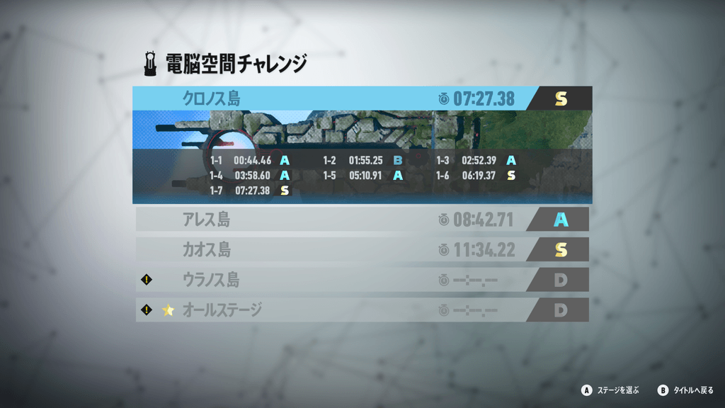 従来型スピードランが楽しめる“電脳空間”の指定のステージを連続してプレイし、最速を目指しましょう! プレイできるチャレンジは、各島のステージを連続で遊ぶものとすべてのステージを連続で遊ぶものがあり、ステージごとにチャレンジの解放条件があります。