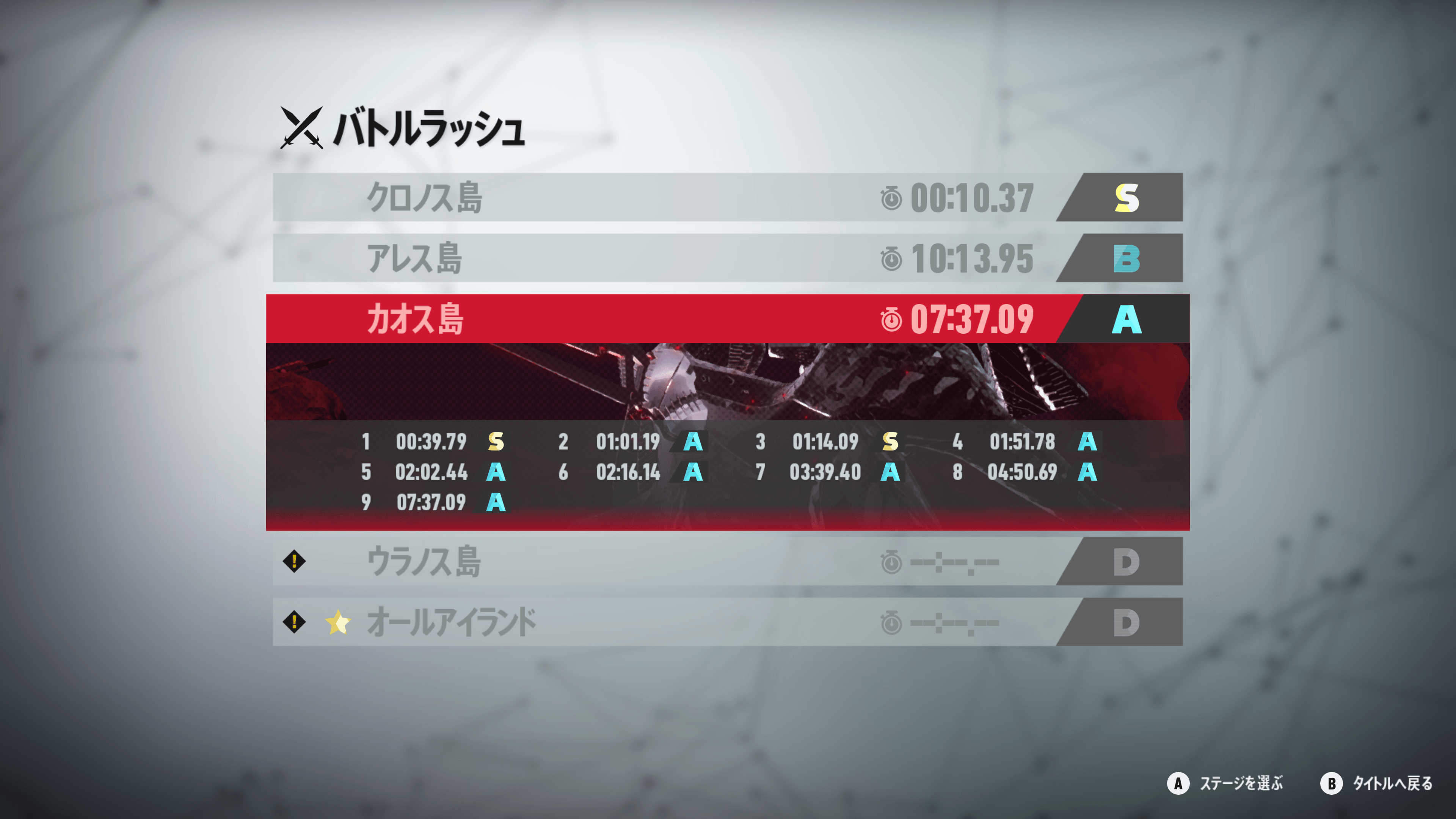 島ごとに登場する神兵/守護神/巨神と連戦して、その撃破タイムを記録することができます。選択したセーブデータの進行度とソニックの成長度(スキル、ステータス)を使用してのプレイが可能で、バトルラッシュごとに解禁条件があります。