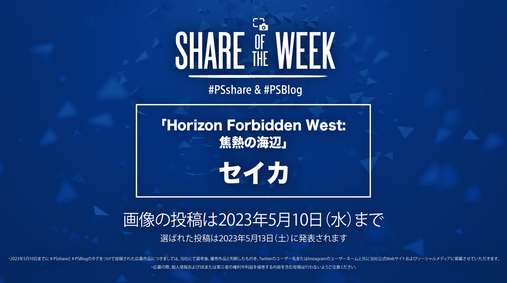 次週のテーマは「Horizon Forbidden West: 焦熱の海辺」の新キャラクター“セイカ”! 新たな冒険でアーロイが出会う頼もしい仲間の“セイカ”をキャプチャして#PSshareと#PSBlog、ふたつのハッシュタグとともに、5月10日(水)までに投稿してください。あなたの投稿が各国のPS公式メディアから世界中に発信されるチャンスです!