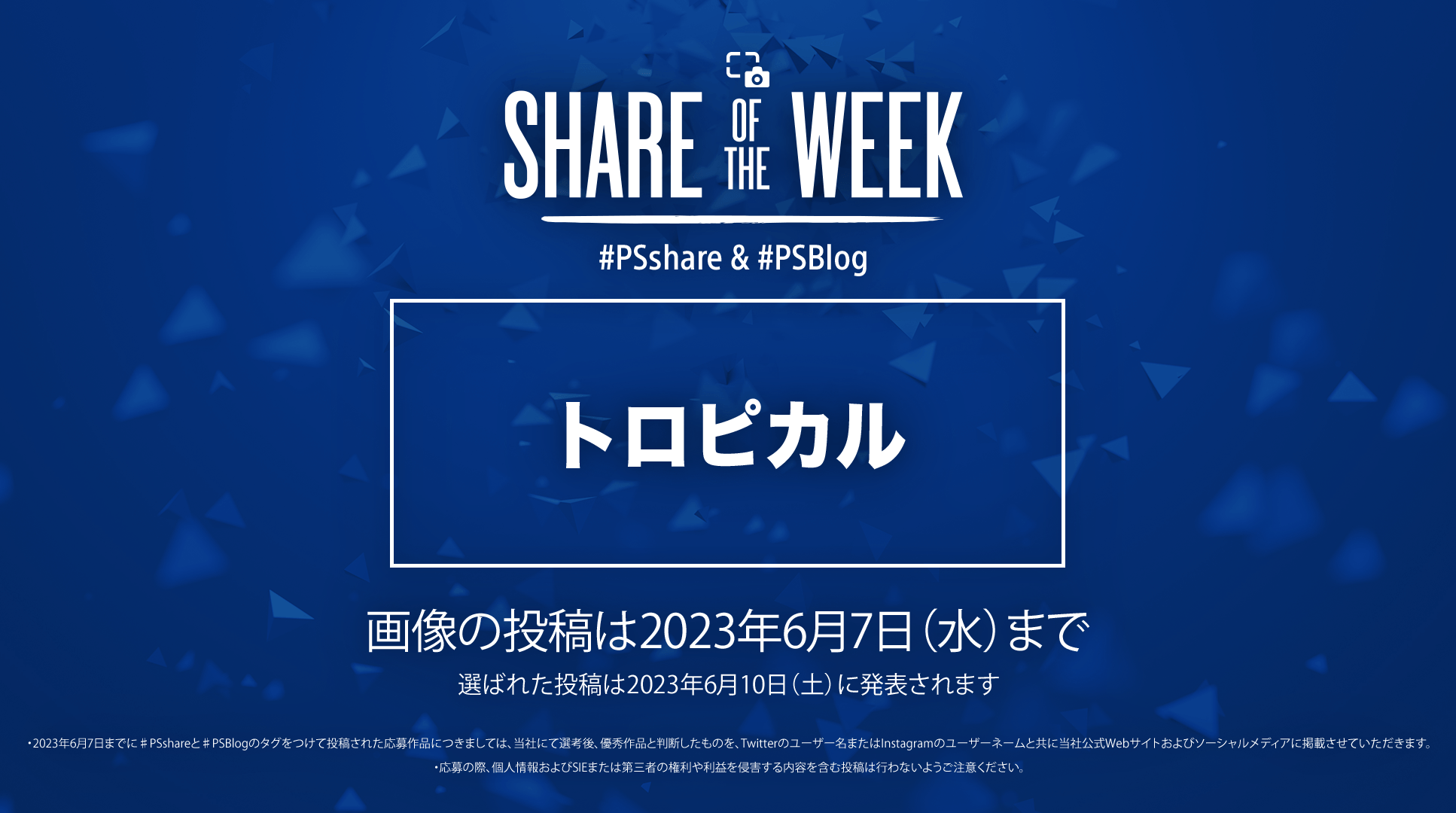 次週のテーマは“トロピカル” ! 外は雨空でもゲームのなかではカンカン照り! お気に入りのゲームの“トロピカル”な瞬間をキャプチャして #PSshareと#PSBlog、ふたつのハッシュタグとともに、6月7日(水)までに投稿してください。あなたの投稿が各国のPS公式メディアから世界中に発信されるチャンスです!