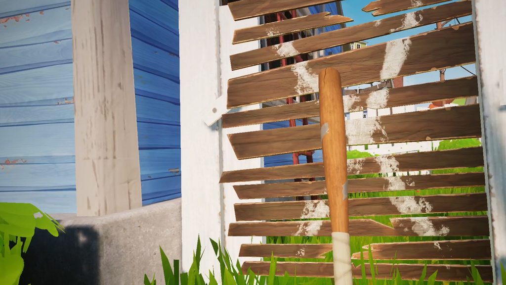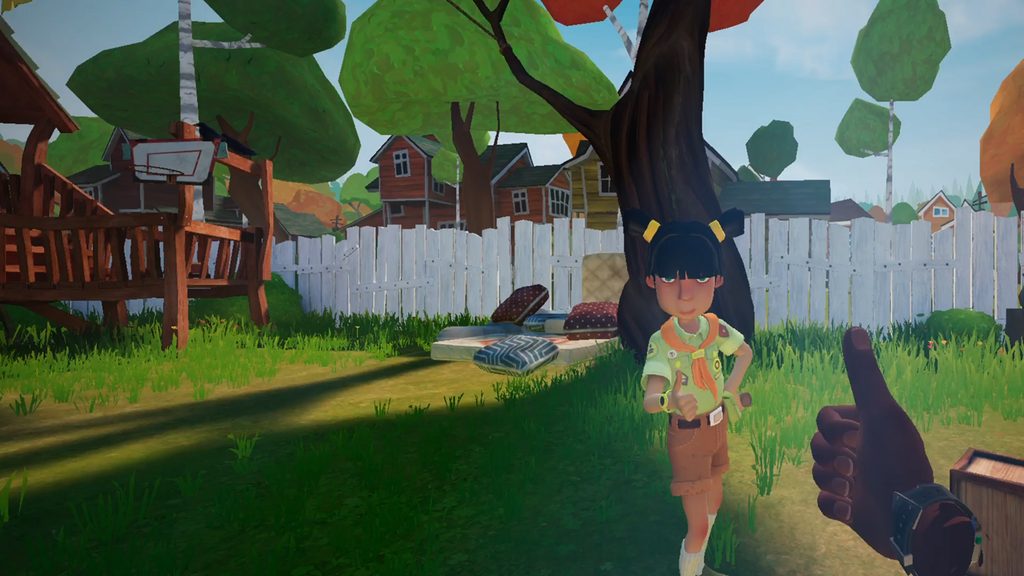 PS VR2専用タイトルである本作では、救出チームの子どもになりきって潜入するリアルな臨場感を味わえる。隣人に見つからないように移動しつつ、周囲をうかがう、ドアを開ける、ギミックアイテムを拾う、あるいはパチンコで狙い撃つ、バットを振るといった動作ひとつひとつが、VR視点でのプレイヤー自身の動きによるものだ。ボルダリングのように壁をよじ登ったり、ポールを掴んで滑り降りたり、風車の羽にしがみついて高い場所に行くシーンもあり、巨大なアスレチックコースで遊んでいるような楽しさも。現実ではボルダリングなんてキツすぎてできないけれど、バーチャルなら軽快に登れて気分がいい。