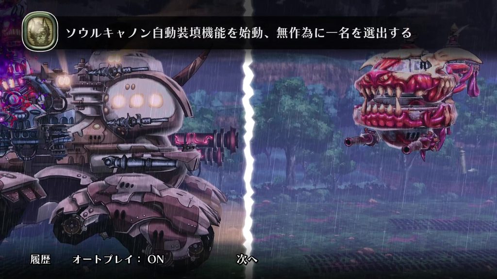 マルトたちが操る戦車「エキゾ・タラニス」は、子どもたちの命を代償とする「ソウルキャノン」、子どもたちの生命力をわずかに使用して放つ「マーナガルム」、ふたつの兵器を搭載した新機体だ。バトルはターン制を採用しており、戦車の砲座に配置された子どもたちが、それぞれ得意な種類の武器で敵を攻撃する。編成を切り替えて弱点を突けば、敵を遅延させ、一方的に攻撃することも可能だ。子どもたちは多彩なスキルを持っているため、適切な配置が勝利の鍵となる。