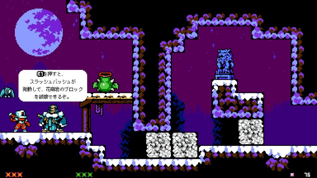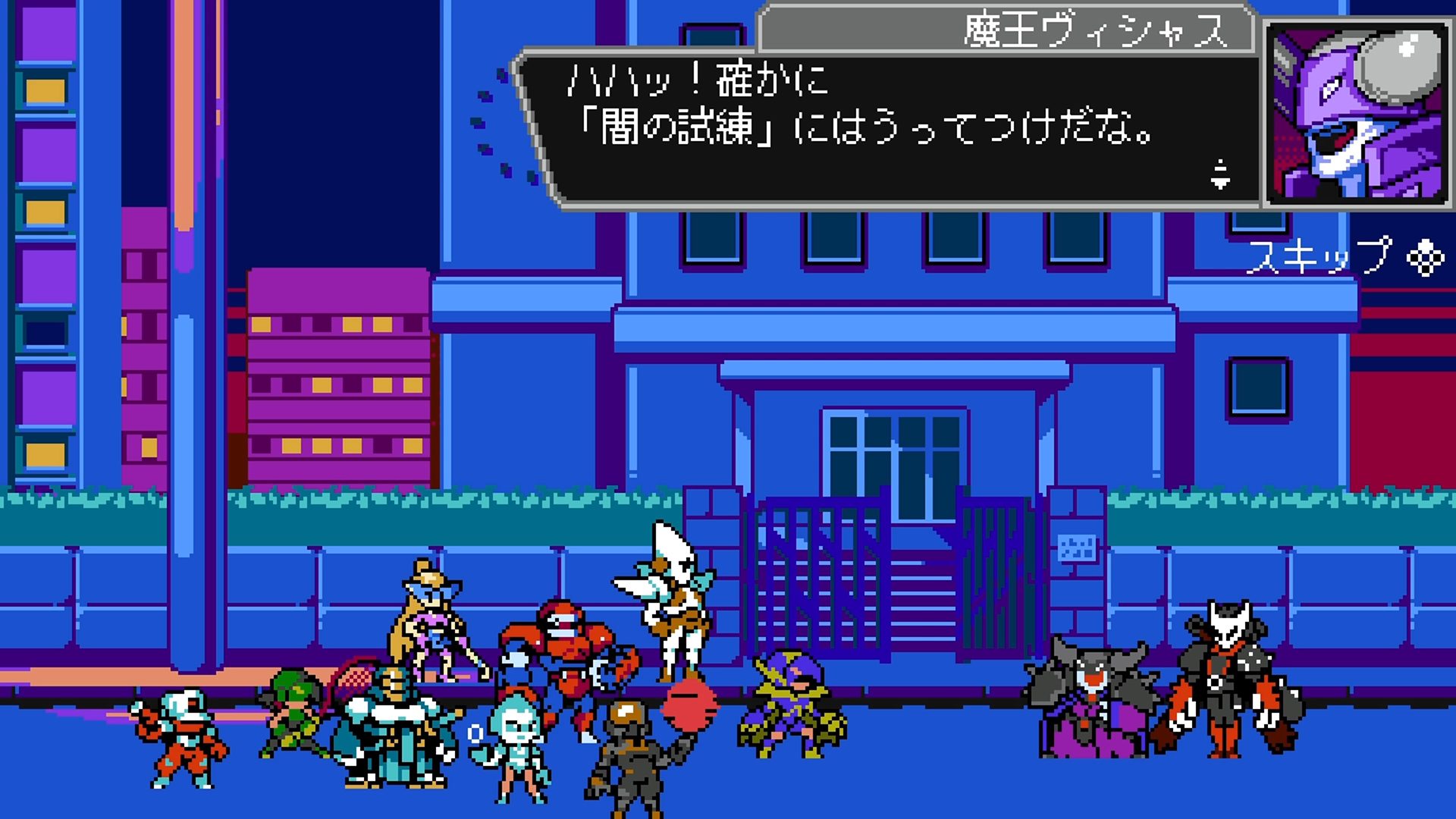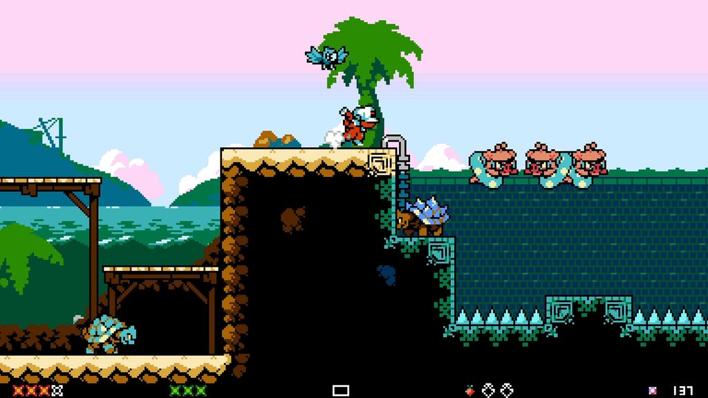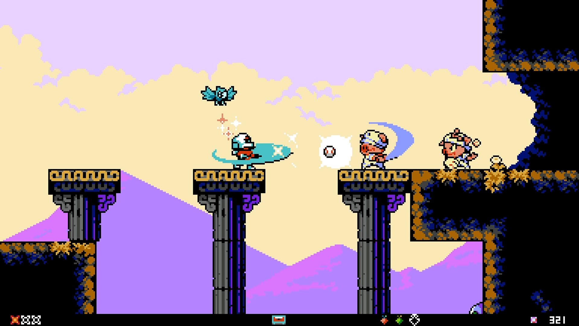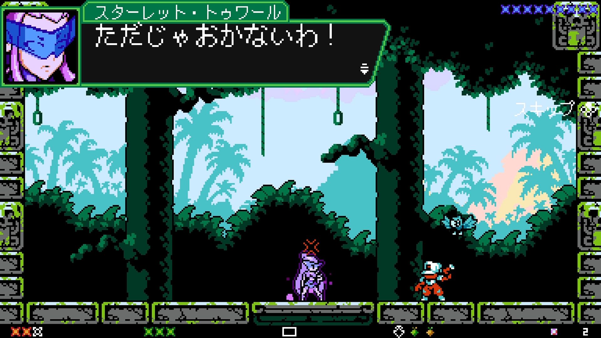 最初に目を引くのはやはりドット絵風のグラフィックで、プレイ画面はもちろんデモシーンまで8bitゲーム機時代の名作アクションを思わせる雰囲気にあふれている。しかし、滑らかなキャラクターの動作や軽快な操作感、遊びやすさなど、実際の触り心地は現代のクオリティにマッチした丁寧な内容。Evader Musicが手掛けるチップチューンのBGMも、どこか懐かしくも新しく大いに気分を盛り上げてくれる。