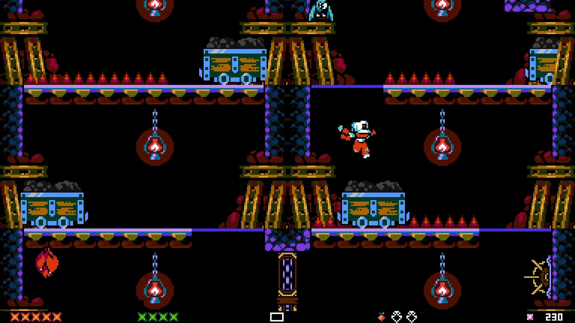 敵と同様にステージのギミックも豊富で、動く床や、回転する鎖付きの鉄球、トゲの床、攻撃で作動するスイッチなど定番の仕掛けから、バットを活用するジャンプ台やスピン攻撃で開く扉まで、さまざまなギミックが行く手を阻んでくる。壊せる壁で隠された隠し通路や宝箱のようなちょっとした探索要素も用意されているので、それらを発見するために繰り返し遊ぶのも楽しい。
