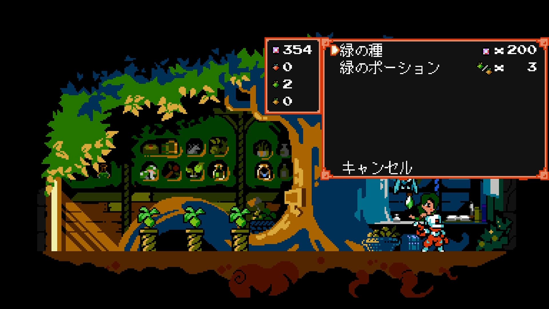 なお、バットボーイのライフと特殊アクションを使うためのスタミナは初期状態だと3個ずつしかないが、全体マップにある薬屋でポーションを作ることで数を増やせる。ライフやスタミナの追加には赤・緑・黄金の実が必要だが、ステージに隠されているものは繰り返しプレイしていると怪しい場所になんとなく気が付くはず。ボス戦でライフ不足に苦労したら、クリア済みのステージでそれぞれの実を探し、バットボーイを強化して再挑戦しよう。