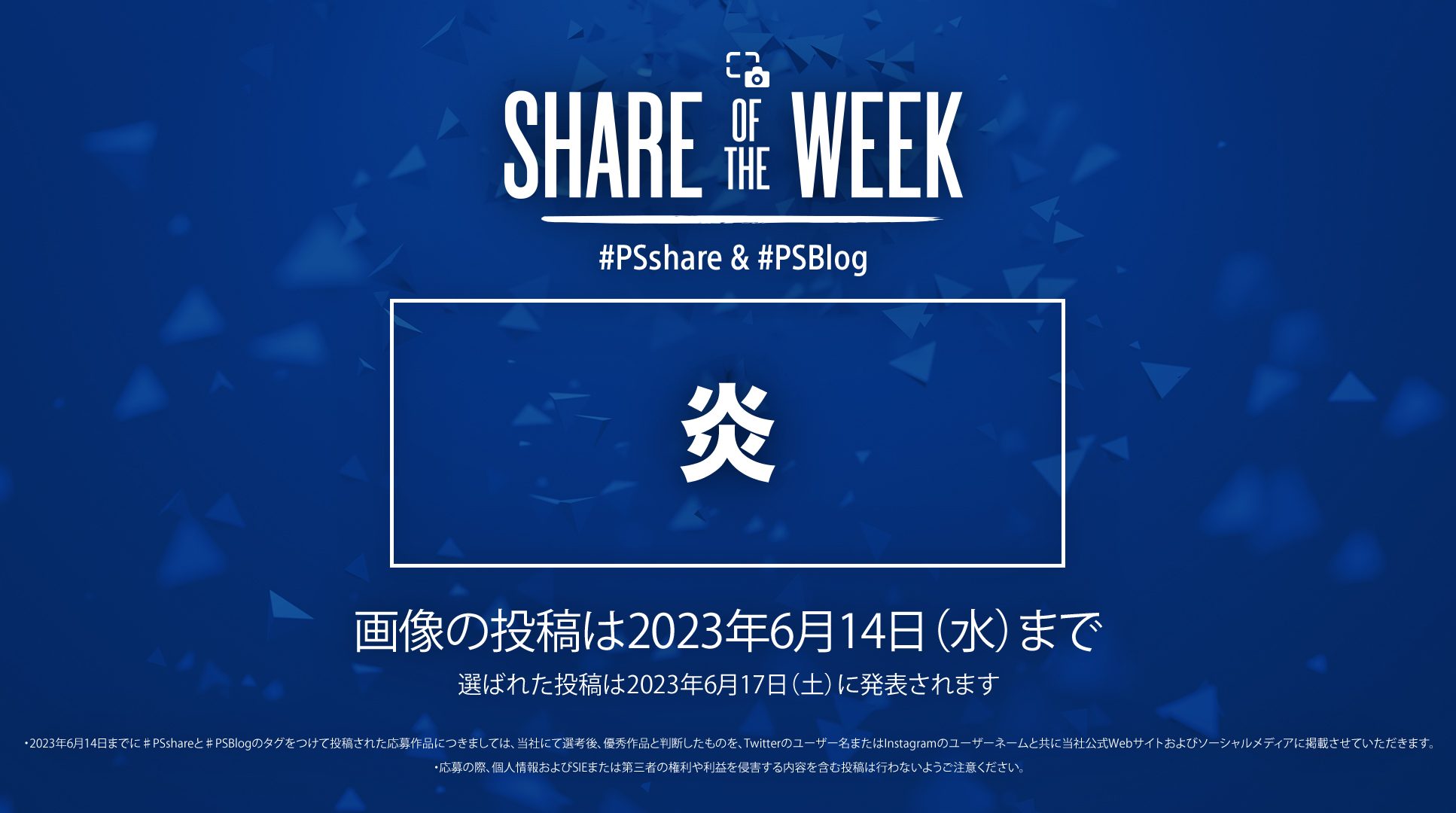 次週のテーマは“炎” ! ゲームの世界でヒートアップ!! お気に入りのゲームで文字通り“燃える”瞬間をキャプチャして #PSshareと#PSBlog、ふたつのハッシュタグとともに、6月14日(水)までに投稿してください。あなたの投稿が各国のPS公式メディアから世界中に発信されるチャンスです!