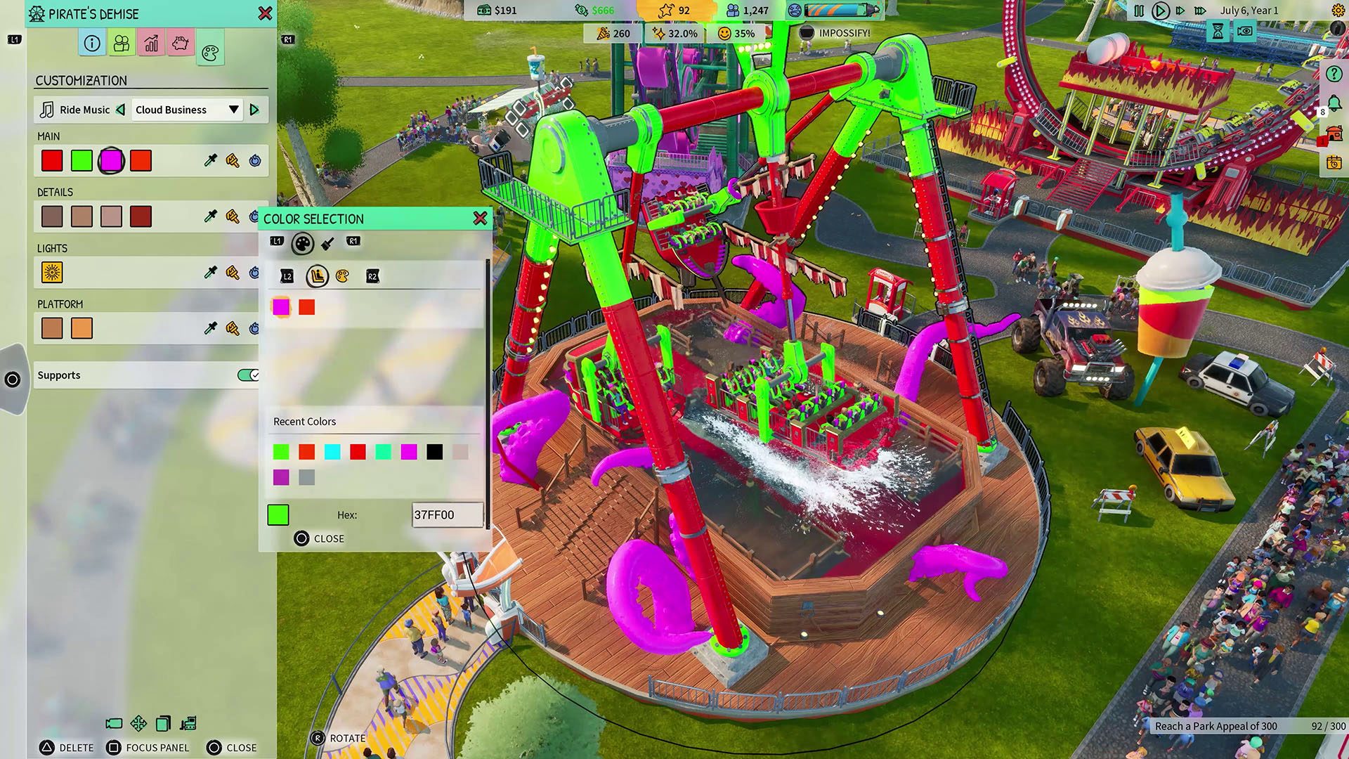 ジェットコースターのようなアトラクションだけでなく、ショップやパークの装飾、地形にまで、自分の個性と創造性を自由に表現しながら夢のテーマパークを作り上げよう!