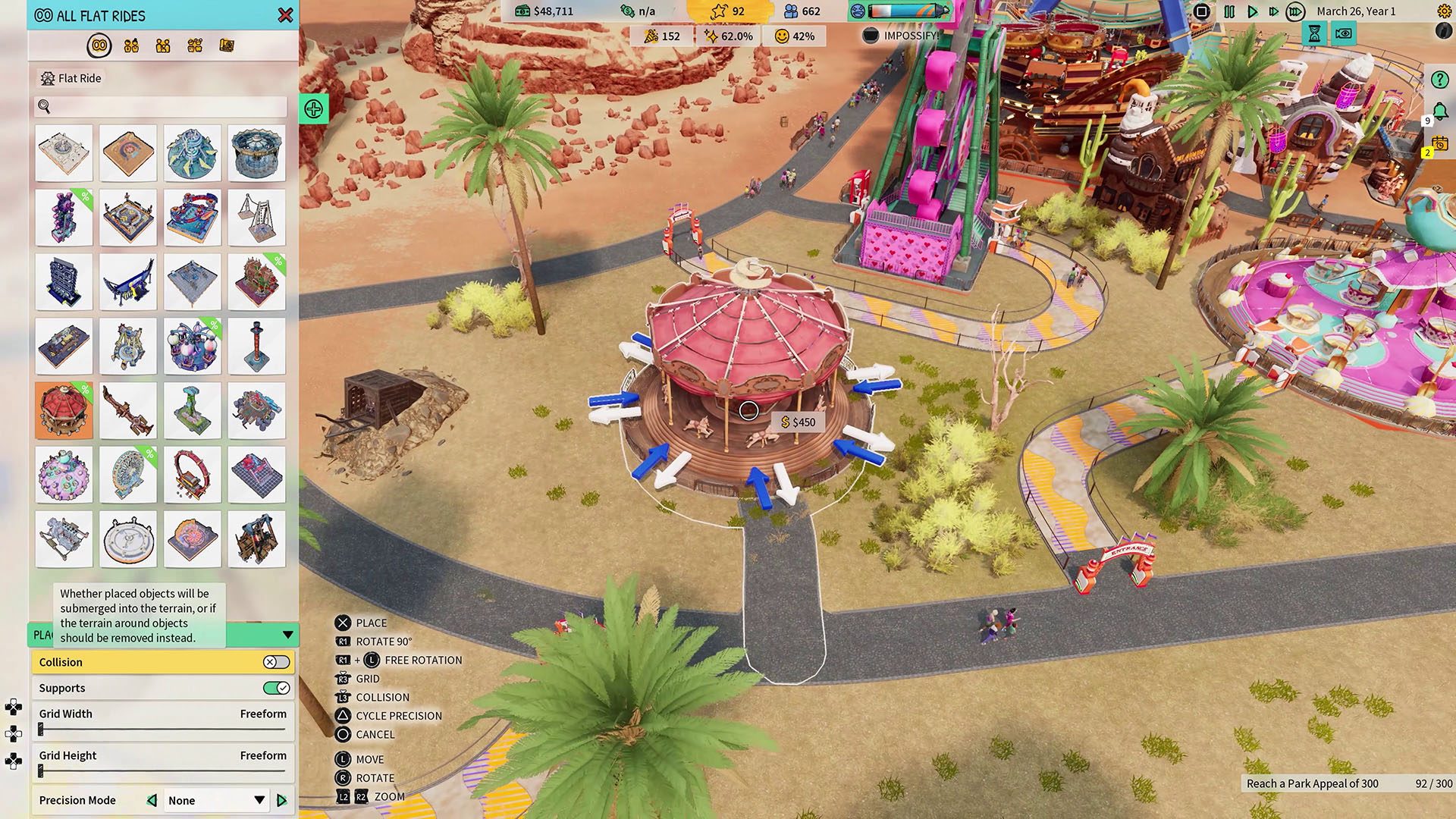 「サンドボックス」モードでは、広大な土地を使って思うがままにテーマパークを作れる。運営資金を無限にしたり、自分に縛りを与えたりといったことも自由に設定可能。さまざまなテーマに分かれた数千の素材やモジュールを組み合わせて、自分だけのテーマパークを運営しよう。