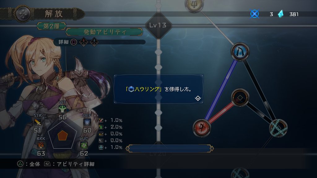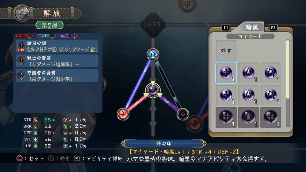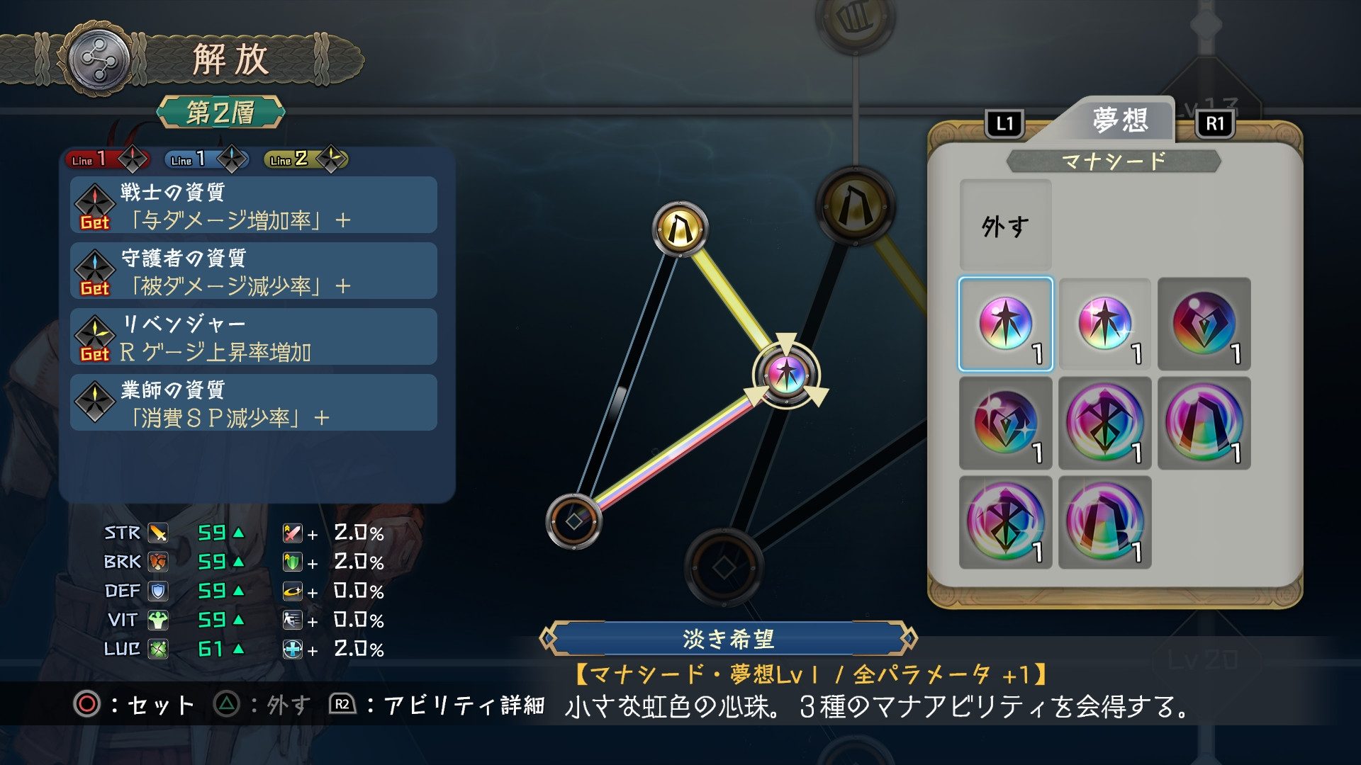 アドルとカージャはそれぞれ個別のレリーズ・ラインを所有しており、レベルアップ時に獲得するマナポイントを使用することで、個別に能力を解放していくことが可能だ。
