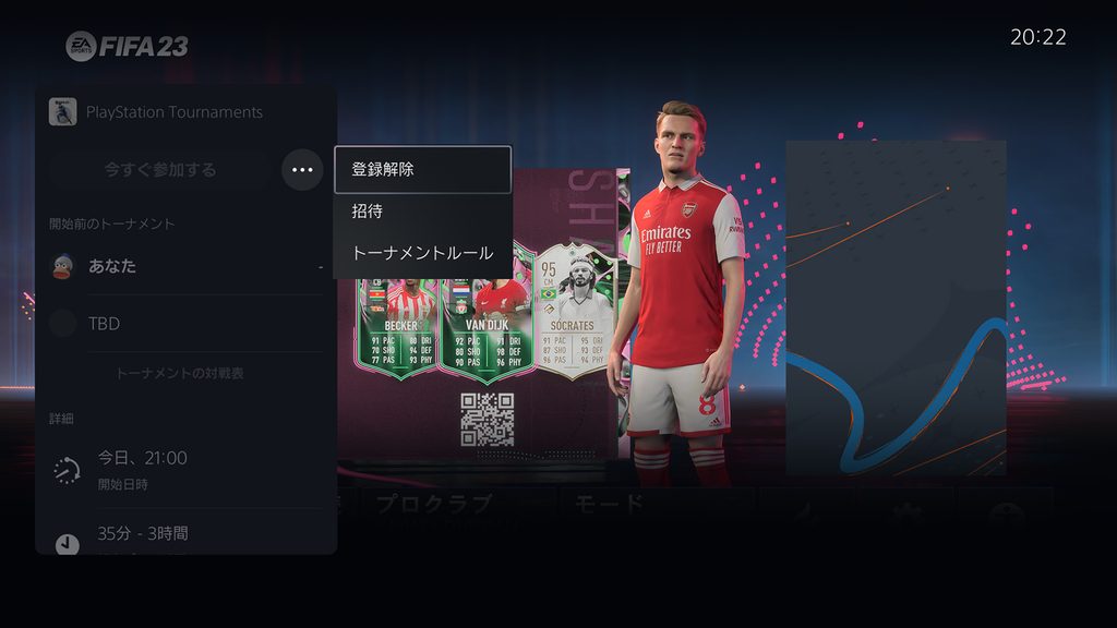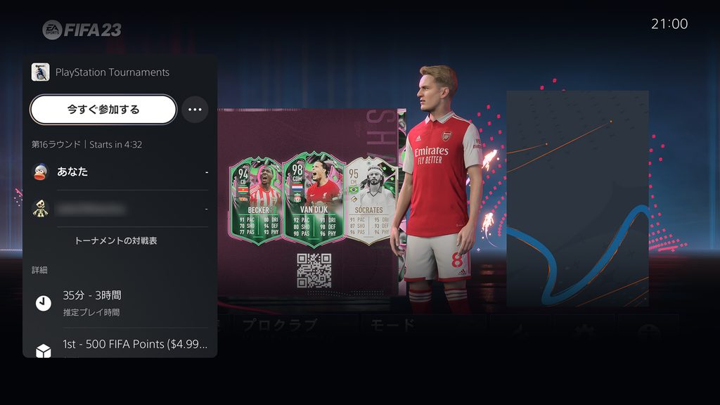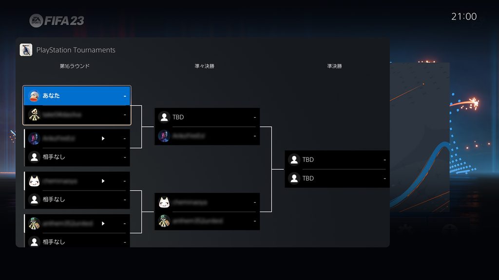 お知らせのポップアップ表示中にPSボタンを押すか、トーナメントカードにアクセスして[今すぐ参加する]を選択すると試合に参加できます。トーナメント開始後は、対戦表と結果を確認できるようになります。