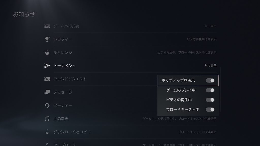 ホーム画面の[設定]から[お知らせ]へと進み、[お知らせをポップアップ表示]を有効にします。お知らせは、どのポップアップをどのように表示するかを個別に設定できます。[トーナメント]の項目のポップアップ表示が有効になっているか確認しておきましょう。