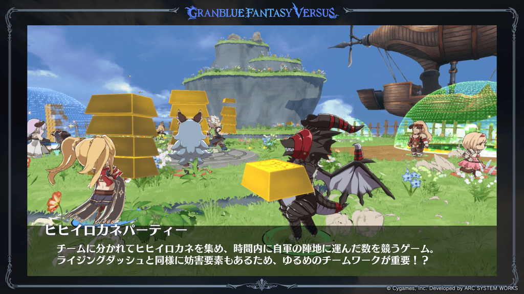 また、アバターを操作して最大30人のプレイヤーが参加可能なパーティゲーム「ぐらぶるレジェンドばとるっ!」に挑戦できる。障害物競走の「ライジングダッシュ」や、自チームの陣地にヒヒイロカネをよりたくさん集める「ヒヒイロカネパーティー」、破壊されていく足場に最後まで立っていた人が勝利となる「キング・オブ・タフネス」など、さまざまなルールのパーティゲームが用意され、格闘ゲームの対戦以外でも盛り上がること請け合いだ。また、看板などがCygamesのコンテンツにジャックされた渋谷のようなマップも登場。これに関しては続報に期待してほしいとのこと。
