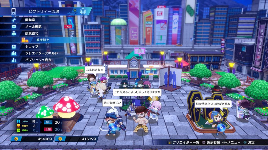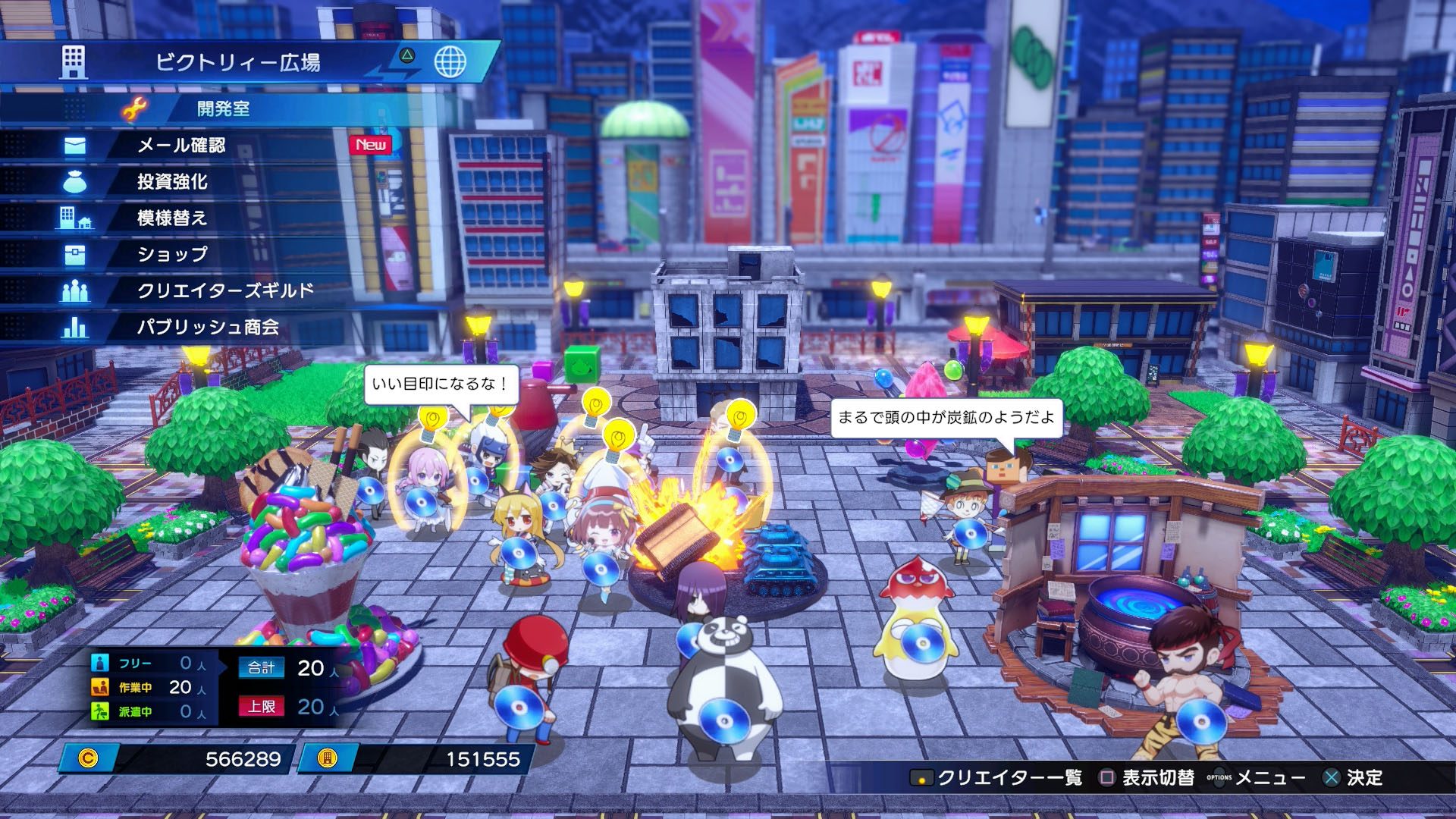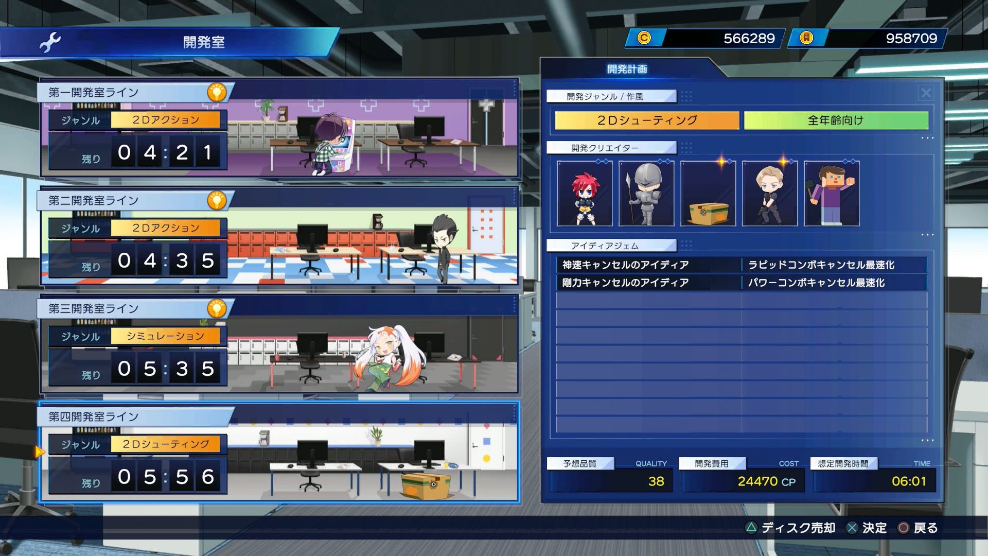 また、会社の広場にオブジェを配置することで、広場にいるクリエイターのステータスが高い状態でディスク開発を行なえる。オブジェによって「基礎品質」「判断力」「開発短縮力」「やる気」など、クリエイターに影響を与えるステータスが異なるので、よく考えて配置しよう。会社へ戻った際には、キャラクターやディスク開発などに影響をおよぼす「経営イベント」が発生する場合も。