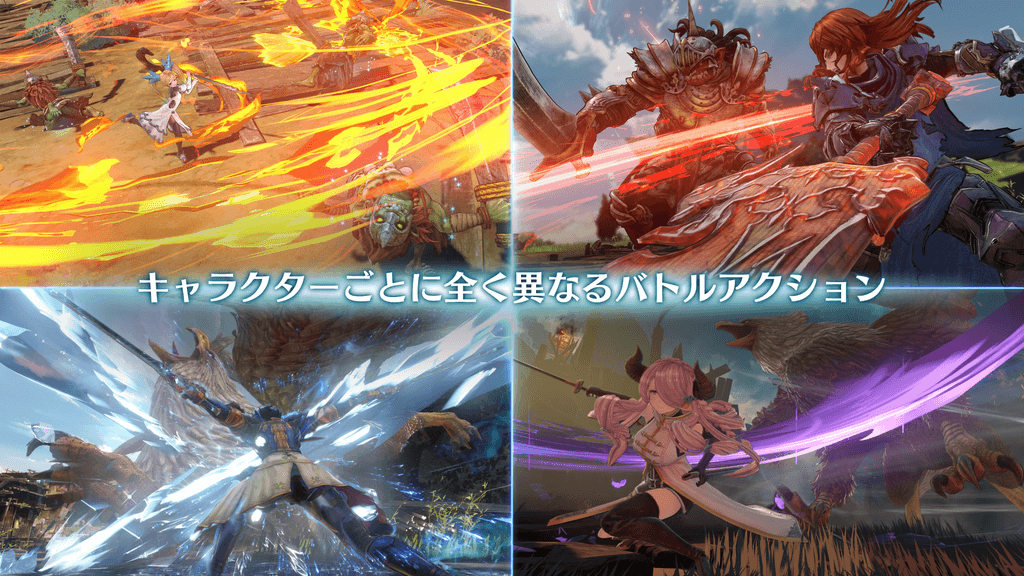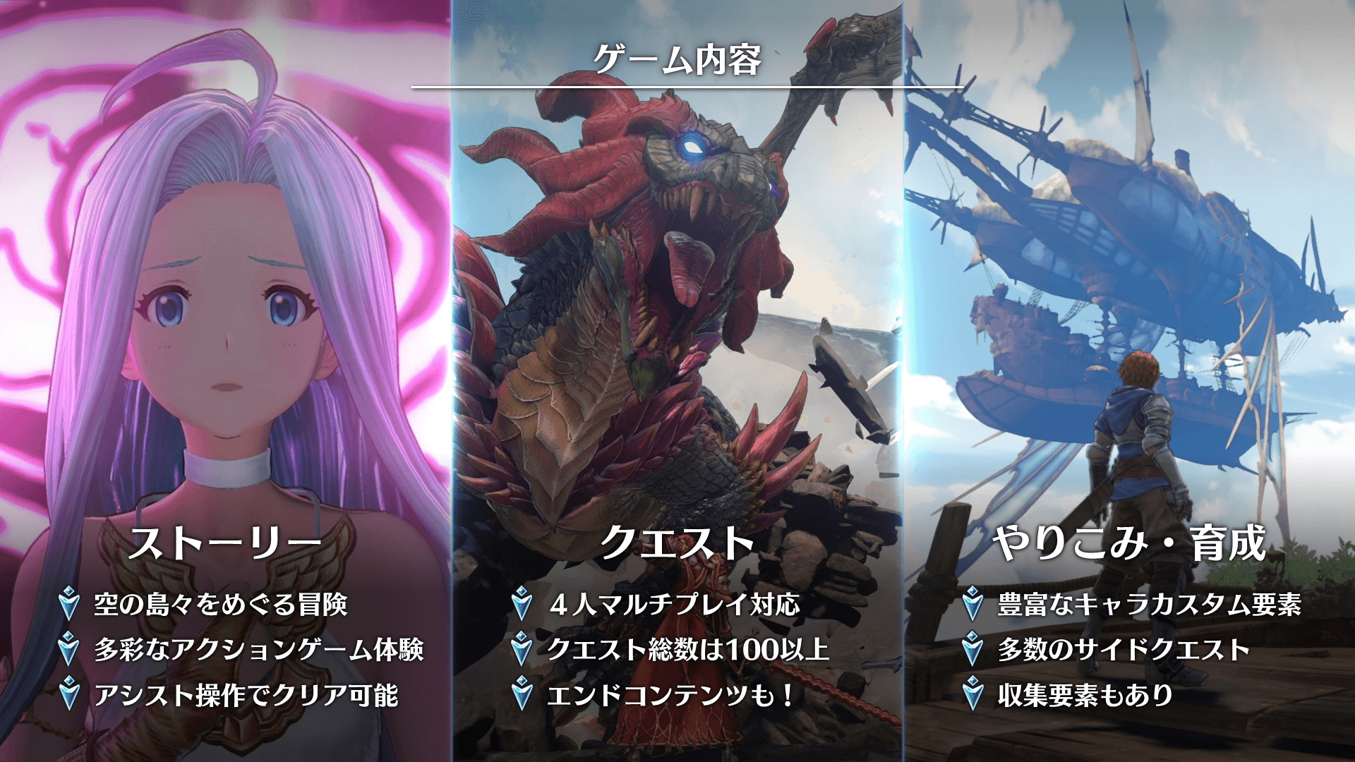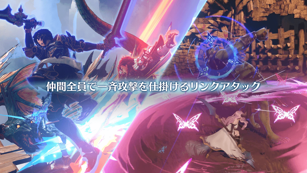 プレイアブルキャラクターには、剣を使って近距離で戦う者、銃や魔法を駆使して遠距離で戦う者など、個性的な戦闘スタイルがある。そのすべてに専用のアクションが用意されており、それぞれの遊び心地や操作感が大きく異なる。ステージでは最大4人までのパーティーを編成して、リアルタイムで敵と戦う。自分が操作するキャラクター以外はNPCが能動的に戦い、生きた仲間とともに戦っている感覚を得られることも本作の特徴だ。また、大型ボスが多数登場し、その中には星晶獣も含まれる。それぞれでユニークなバトルを楽しむことができ、またプレイヤーがプロトバハムートを操作して戦える場面もあるという。
