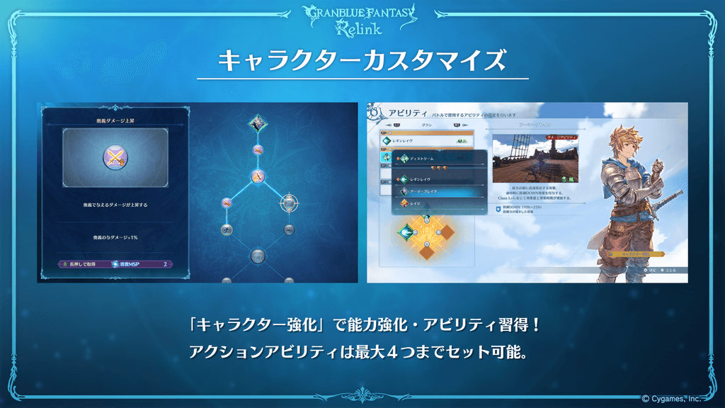 各キャラクターは個別に強化できるほか、アビリティも習得可能だ。アビリティは攻撃重視や支援重視など必要に応じて4つまでセットできる。また、キャラクターに武器とジーン(スキル)を装備させることによって、さまざまな効果のビルドを実現できる。自分のプレイスタイルに合う、キャラクターと装備の組み合わせを探す楽しさを味わえる。