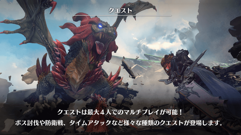 クエストは最大4人でのマルチプレイが可能。街に他プレイヤーを呼んでクエストに出掛けることも、クエストを選択してから同じクエストに挑戦しようとしているプレイヤーと手軽にマッチングすることもできる。クエストには、ボスを倒すもの、制限時間内にどれだけ敵を倒せるか試すもの、防衛対象を敵から守り抜くものなど、さまざまなルールがあり、その総数は100種類以上になるそうだ。