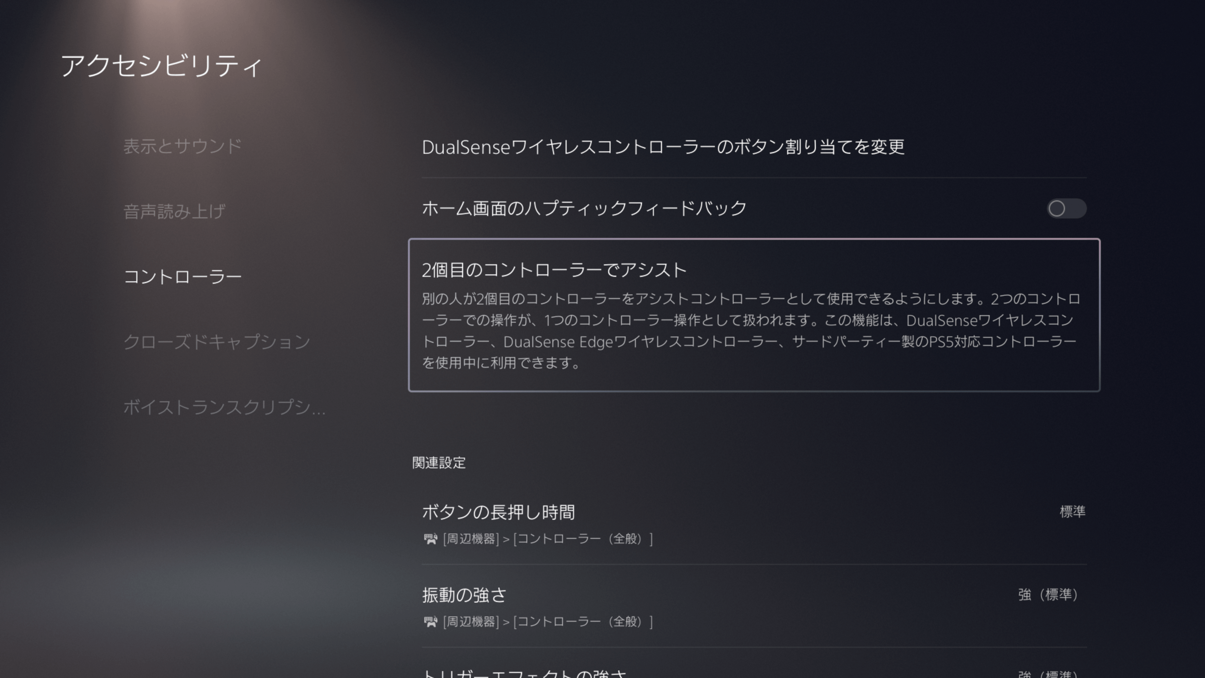 - アシストコントローラーを利用できるようにするには、[設定] > [アクセシビリティ] > [コントローラー] > [2個目のコントローラーでアシスト]を選び、[アシストコントローラーを使う]をオンにします。