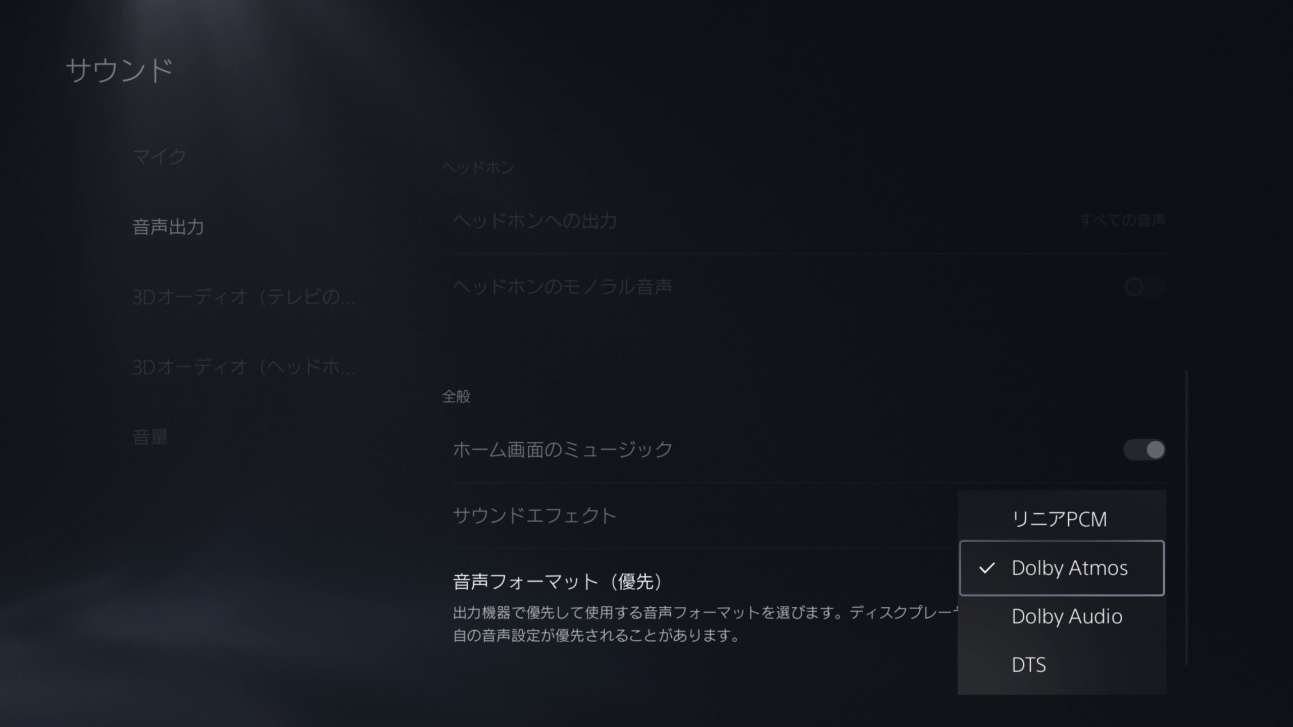 - Dolby Atmosを有効にするには、[設定] > [サウンド] > [音声出力] >[音声フォーマット(優先)]で[Dolby Atmos]を選んでください。