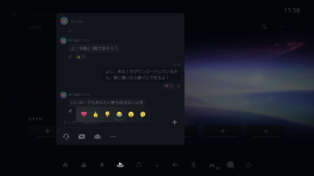 - 絵文字でメッセージにリアクションを追加。メッセージに対して絵文字でリアクションを追加できるようになり、より素早く、簡単にフレンドとコミュニケーションがとれるようになりました。