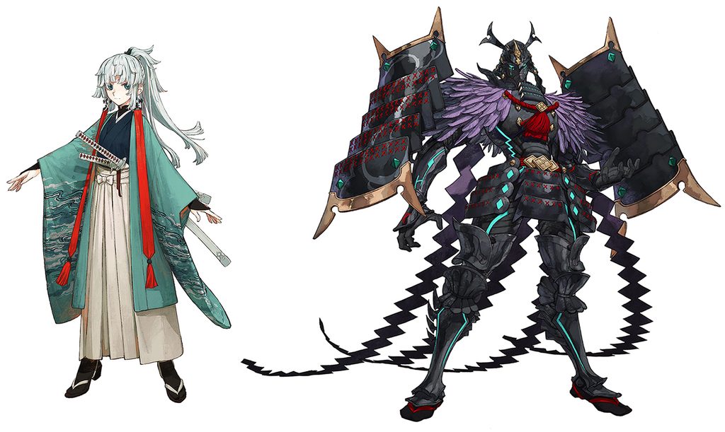 (右)「騎兵」のクラスを持つサーヴァント。黒鎧に身を包んだ、寡黙なる武者。身の丈ほどもある大太刀を淡々と振るい、無慈悲に敵を屠る。