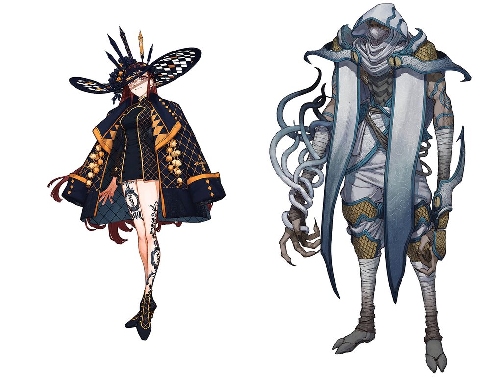 (右)「暗殺者」のクラスを持つサーヴァント。長い手足を鞭のようにしならせる灰衣の怪人。多数の妖蛇を眷属として呼び寄せ、操ることができるという。
