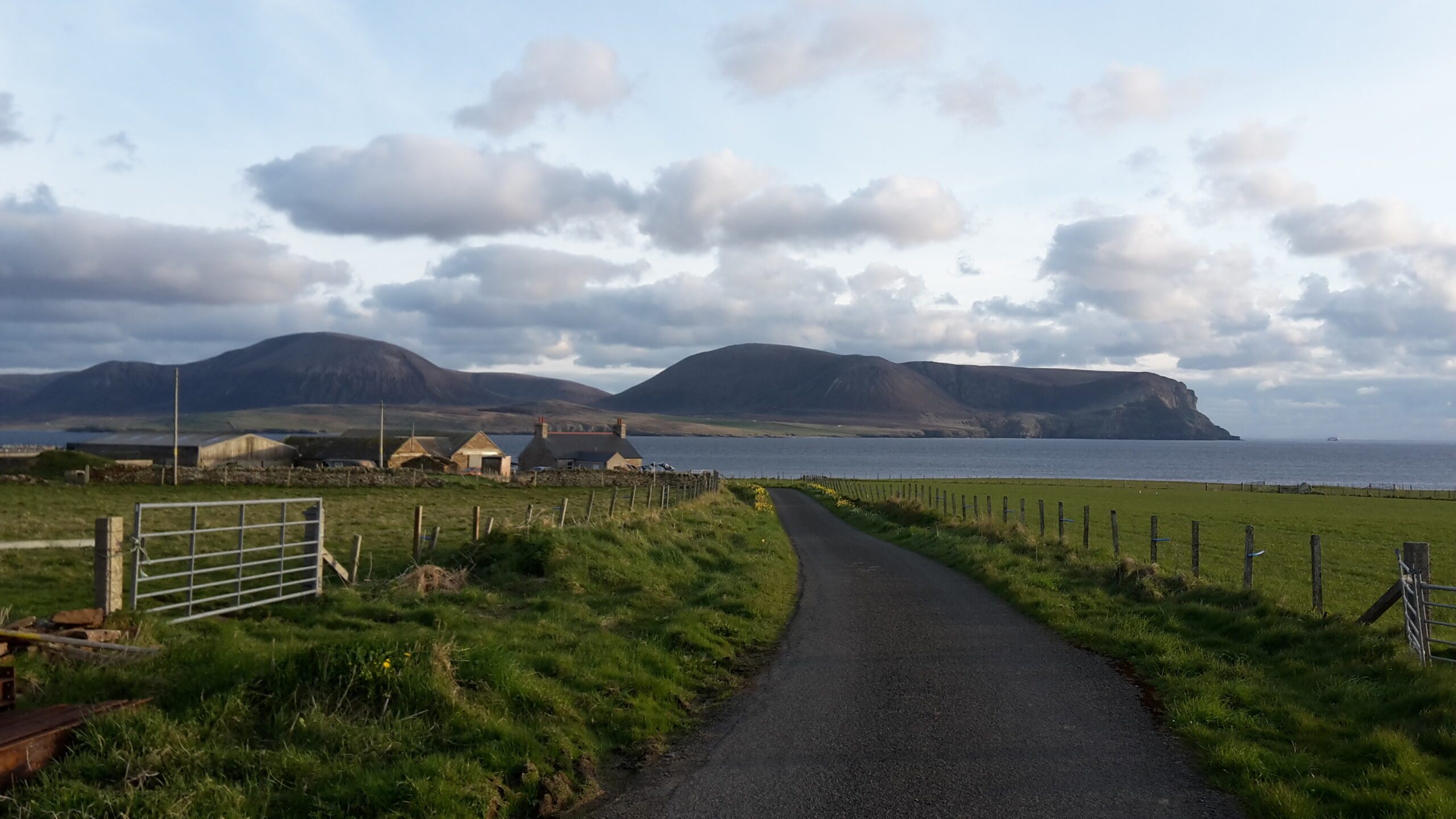 オークニーのウェストメインランドから見たホイ島。手前には緑の野原、フェンス、農場の建物群があります。遠くには茶色の高い丘がふたつ見えます。その間に、穏やかな青い海が細長く伸びています。
