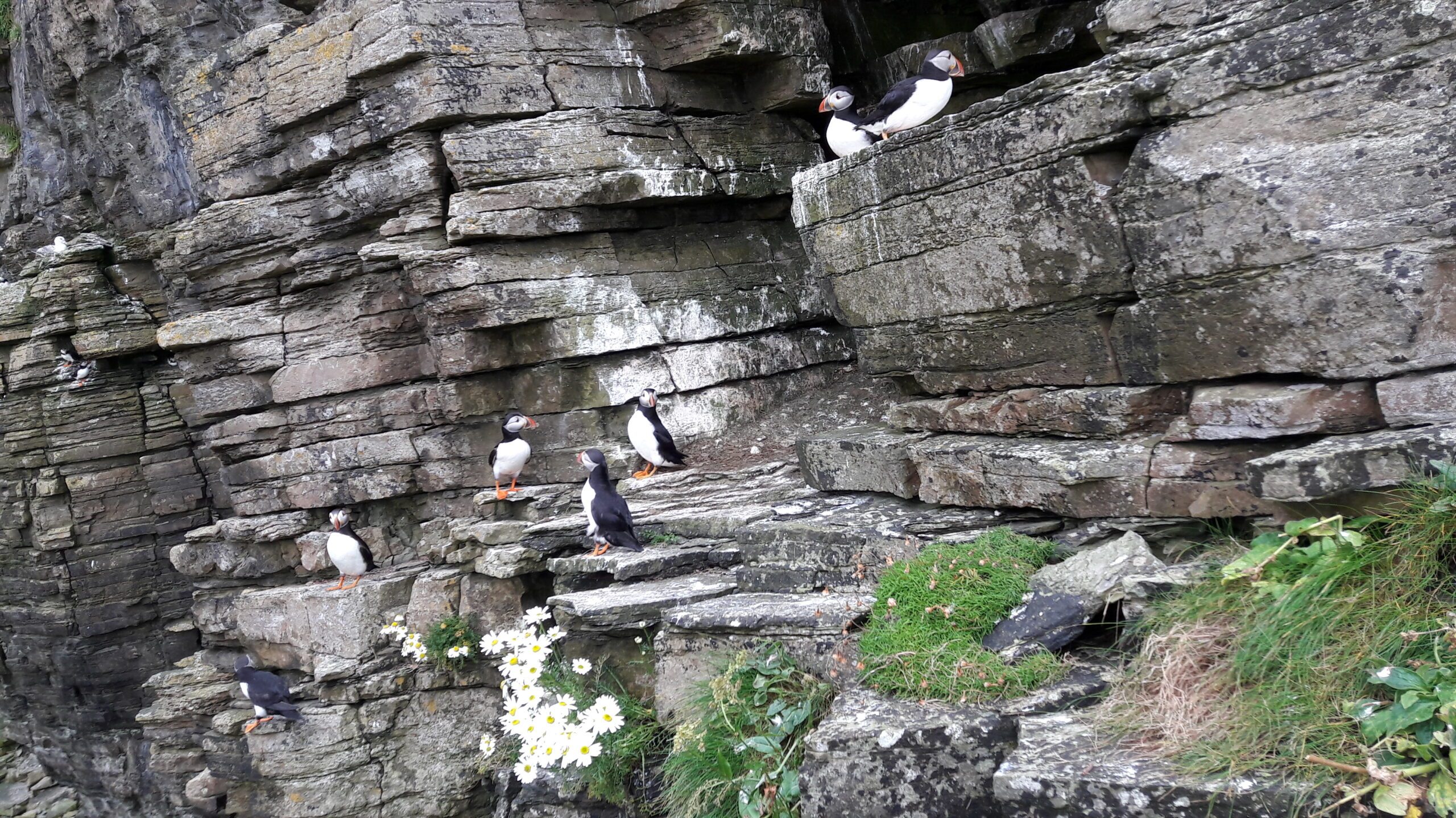 オークニー、ウェストレイのブリアン城。灰色の石の崖を背景に、パフィン(私の故郷の言葉では“tammie-norries”と呼ばれます)の小さな群れがいます。パフィンの黒と白の羽とカラフルな縞模様のくちばしは、鮮やかではっきりしています。