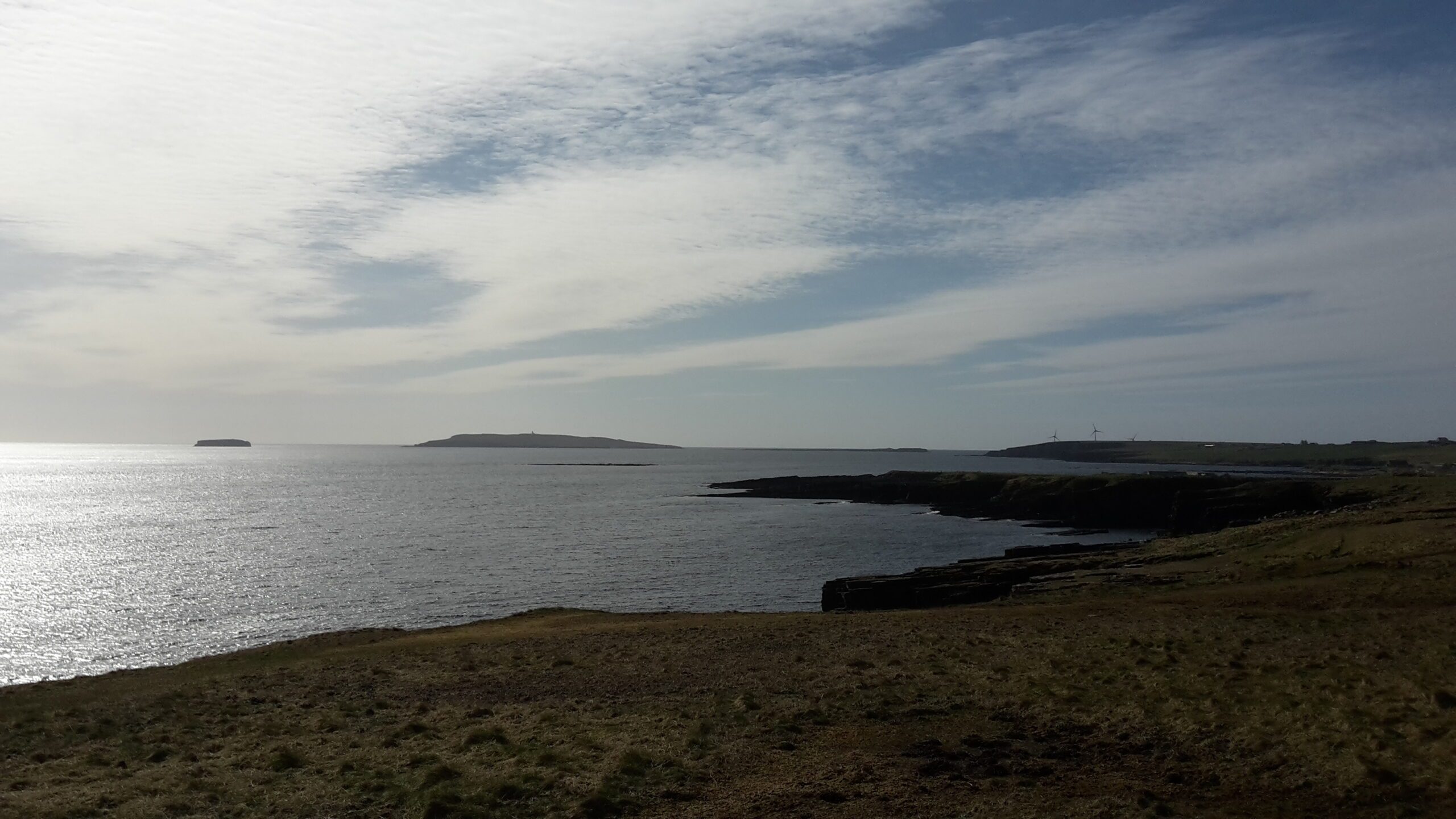 オークニー、ディアネスからのコピンセイの眺め。青と白のまばゆい空の下、夕日が海にきらめき、陸地が暗くなっていく島の風景。水平線に古い灯台と新しい風力タービンが見えます。