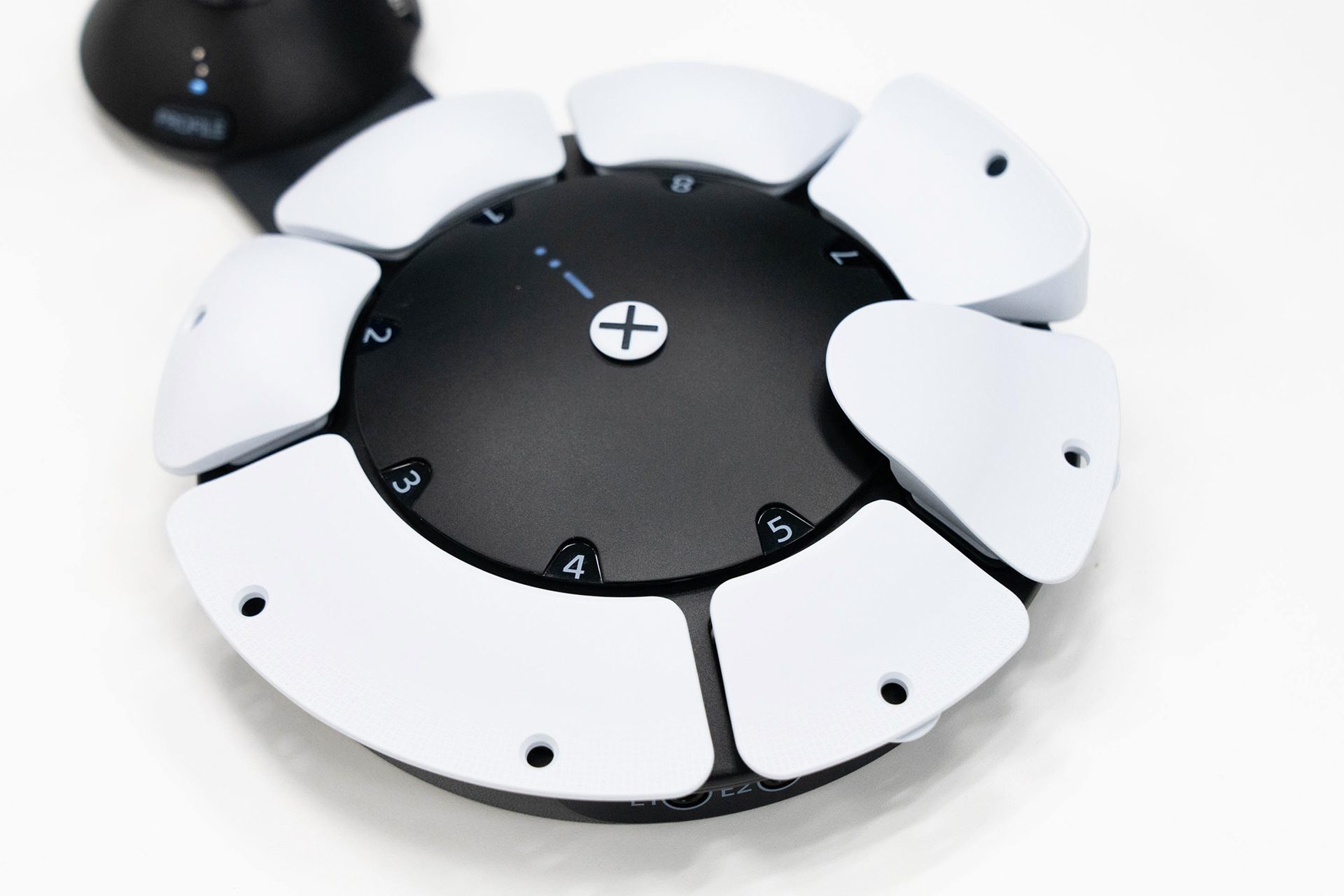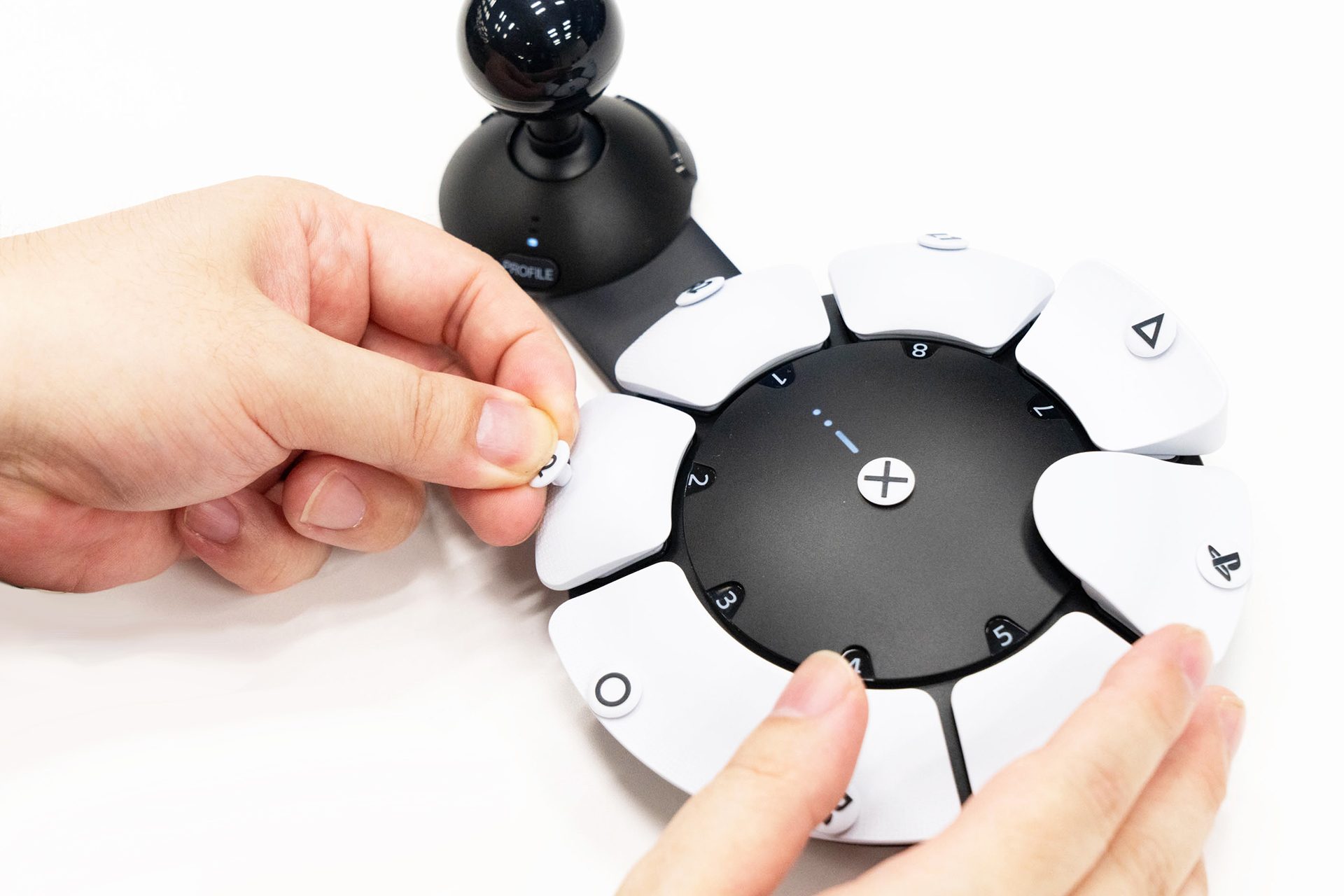 また、従来のコントローラーは手で持ってプレイするスタイルを想定していますが、この「Access コントローラー」は身体から離れた位置や適切な位置にセッティングすることが可能です。身体の動きに制限がある人の、姿勢や動きに合わせることができるんです。円形に配置されたボタンは、手を広げた際に指先で自然に複数のボタンを押すことができました。形状の変更が可能なボタンは、手や指を最小の動作で押すことを可能としていました。指を伸ばしたときに押せる形状や、曲げたときに押せる形状を選ぶことができました。