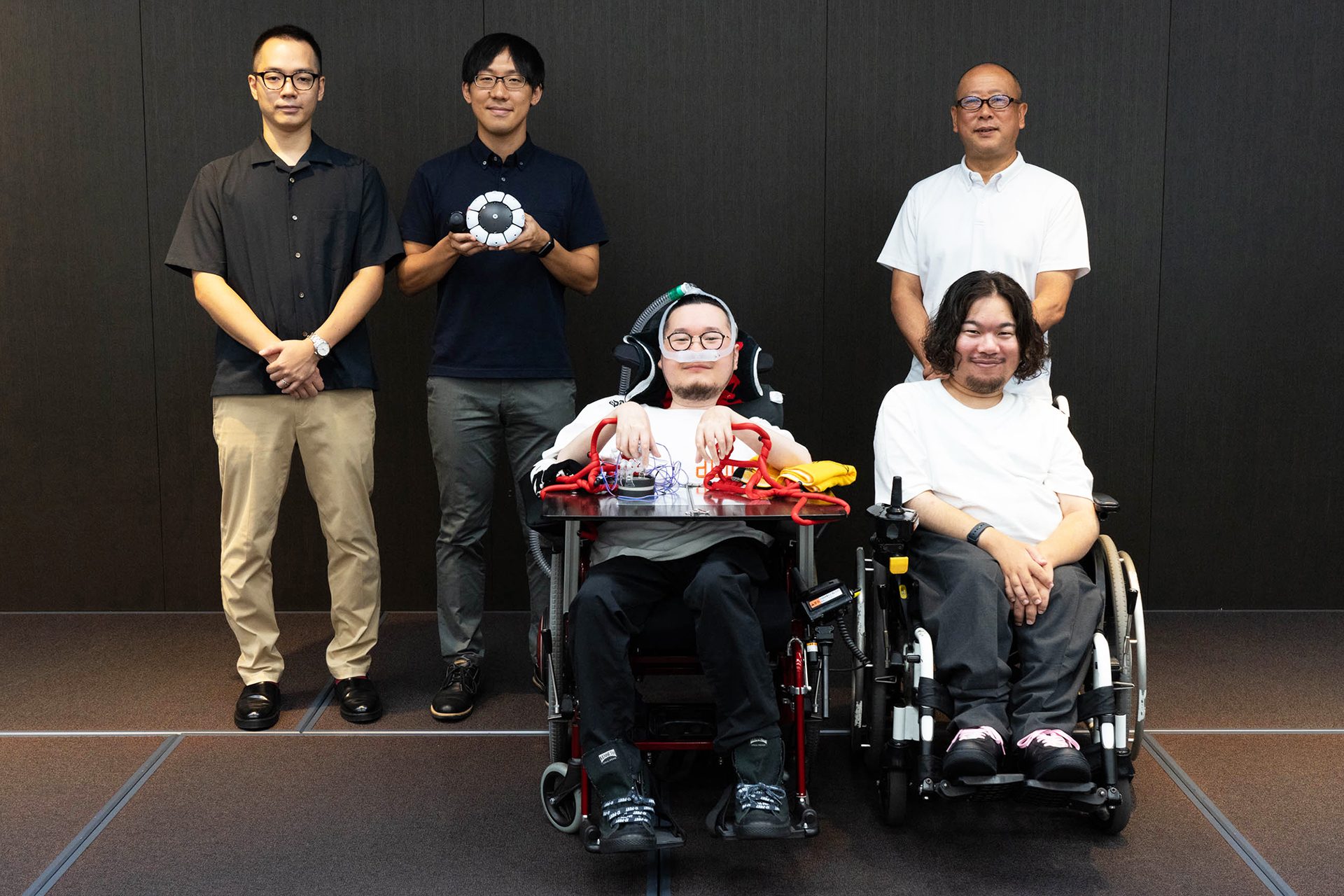 ▲SIE堀越朝(後列左)、池ノ谷優一郎(後列中)、一般社団法人日本支援技術協会・田代洋章氏(後列右)、株式会社ePARA所属・畠山駿也氏(前列左)、テクノツール株式会社・干場慎也氏(前列右)。