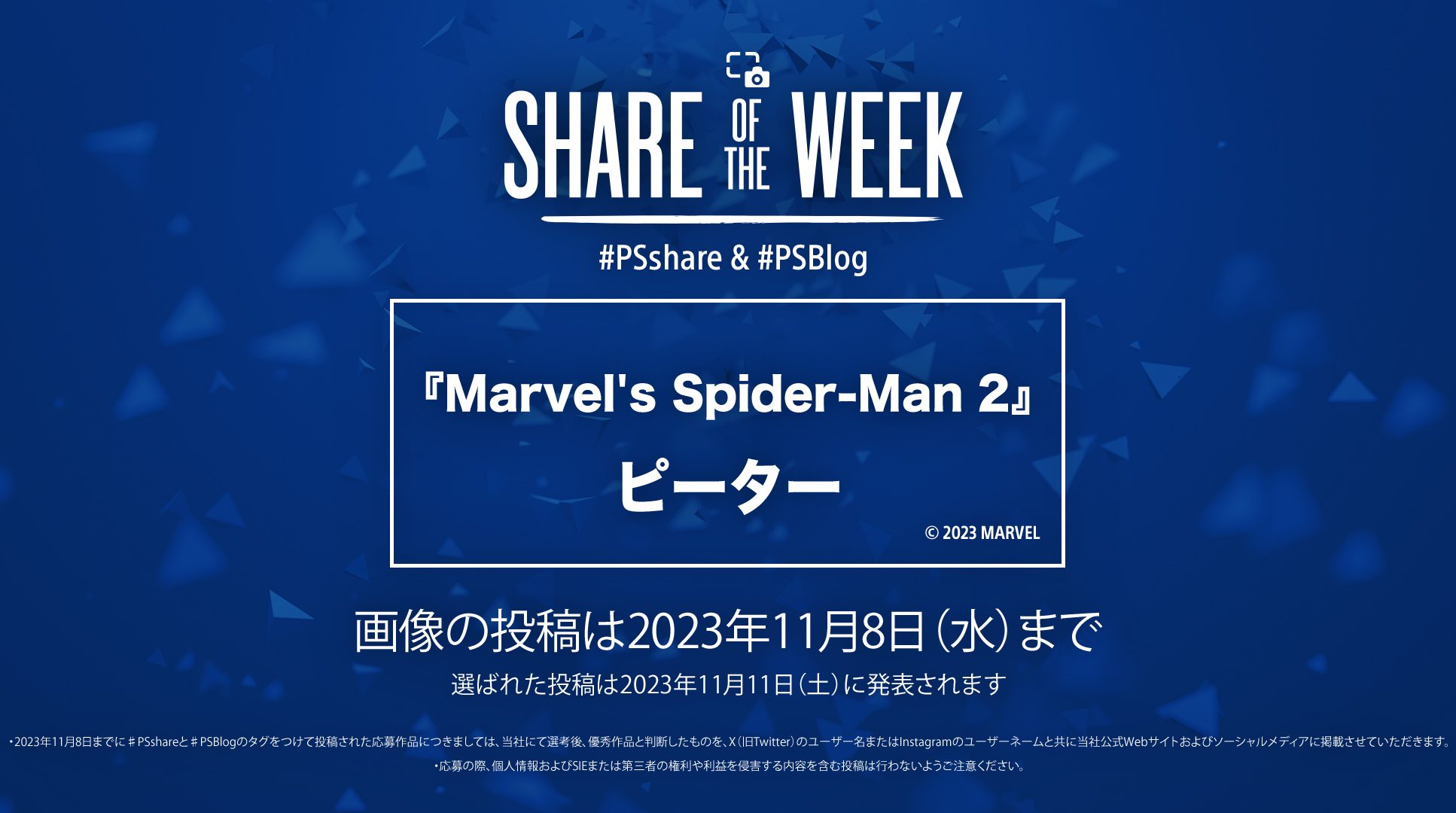 次週のテーマは『Marvel’s Spider-Man 2』- ピーター・パーカー! ひとり目のスパイダーマンをスクープ! ピーターのお気に入りの瞬間をキャプチャして#PSshareと#PSBlog、ふたつのハッシュタグとともに、11月8日(水)までに投稿してください。あなたの投稿が各国のPS公式メディアから世界中に発信されるチャンスです!