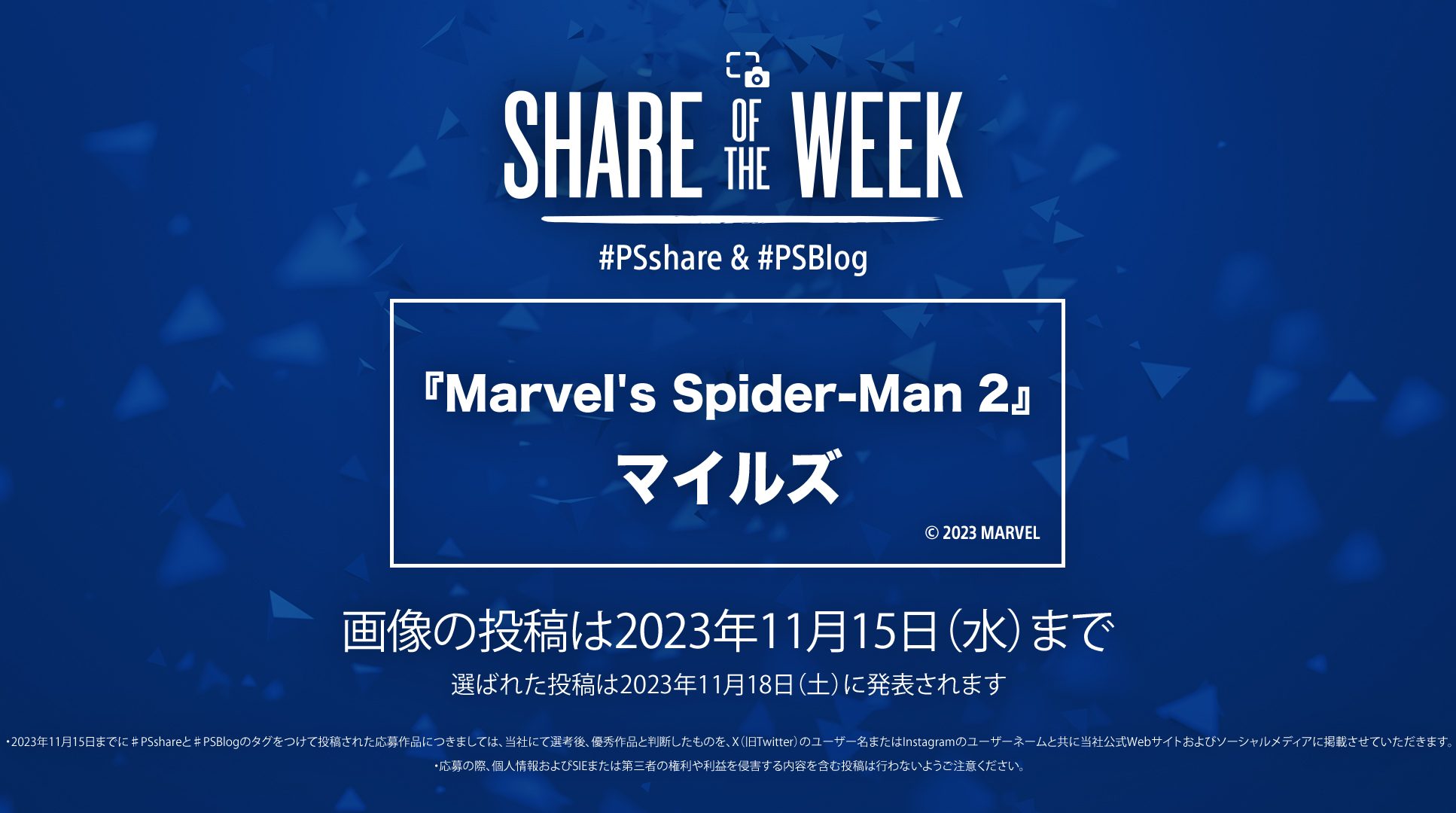 次週のテーマは『Marvel’s Spider-Man 2』- マイルズ! ふたり目のスパイダーマンをフィーチャー! マイルズのお気に入りの瞬間をキャプチャして#PSshareと#PSBlog、ふたつのハッシュタグとともに、11月15日(水)までに投稿してください。あなたの投稿が各国のPS公式メディアから世界中に発信されるチャンスです!