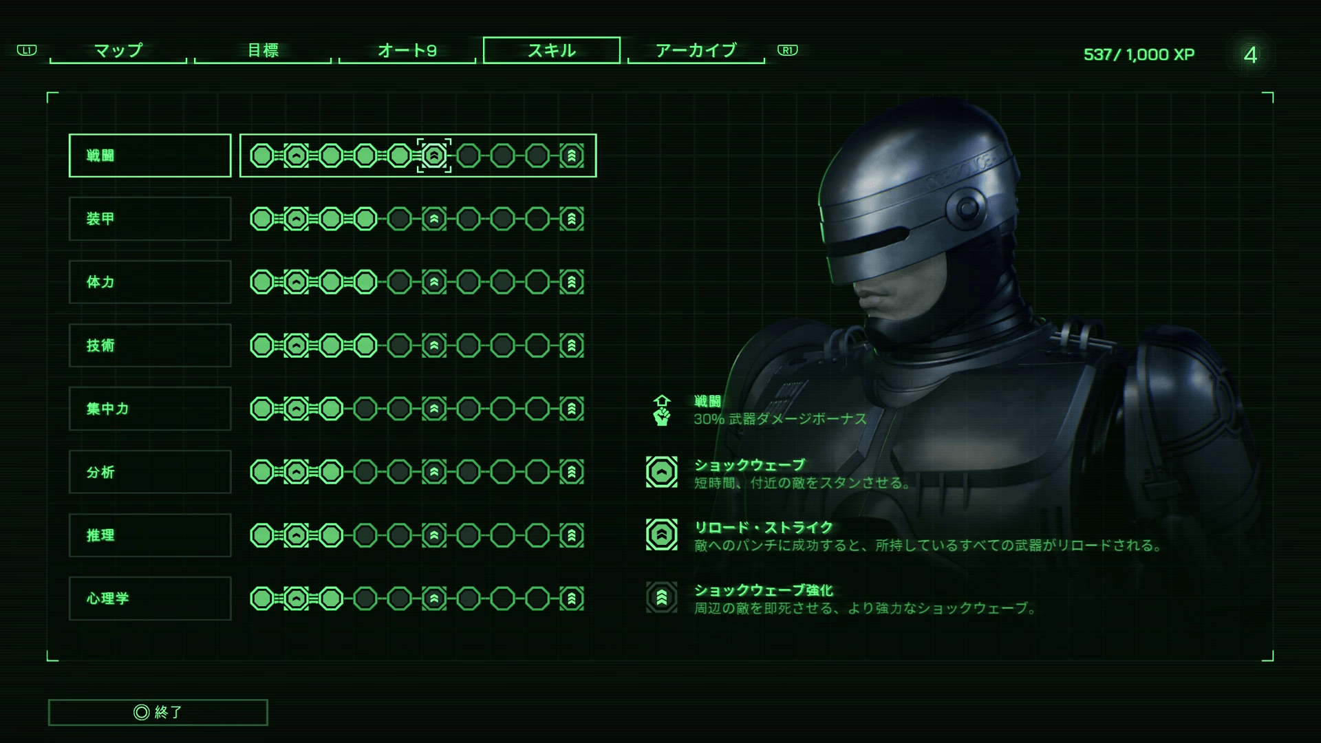 犯罪者たちを倒したり、市民を助けたりすることで経験値が手に入りレベルが上がっていくRPG要素も本作の魅力です。レベルアップ時に貰えるスキルポイントを消費してロボコップ自身を強化できます。