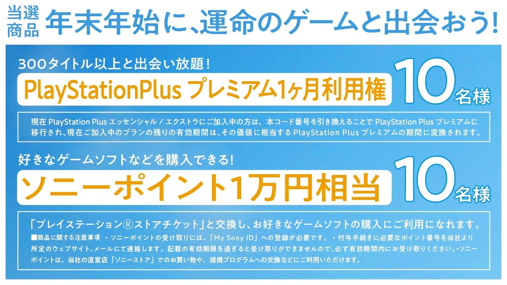 PlayStation Plus プレミアム 1ヶ月利用権を抽選で10名様、「ソニーポイント」1万円相当を抽選で10名様、合計20名様にプレゼントします。