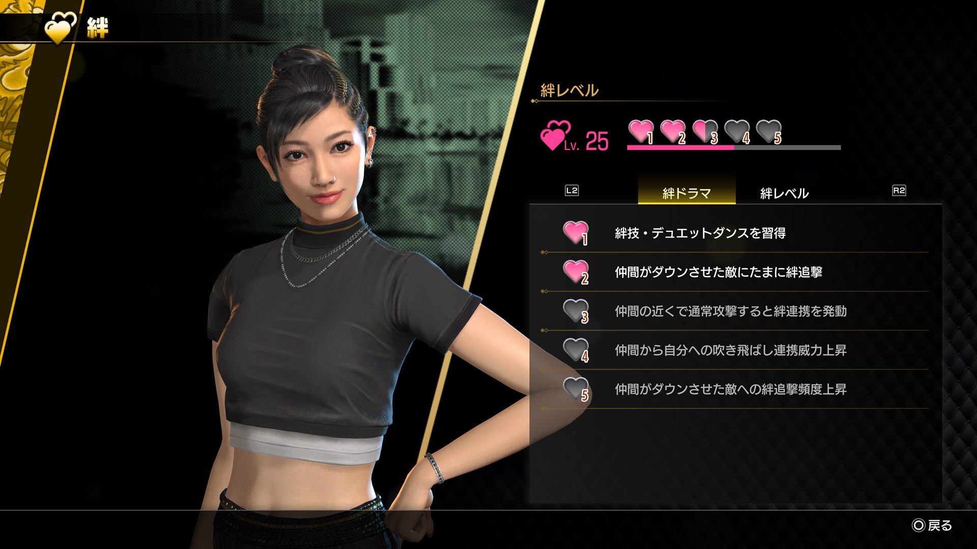仲間たちには、春日や桐生との絆の強さを示す「絆レベル」というステータスがあり、絆レベルが一定まで達すると、転職できるジョブや使える技が増える。