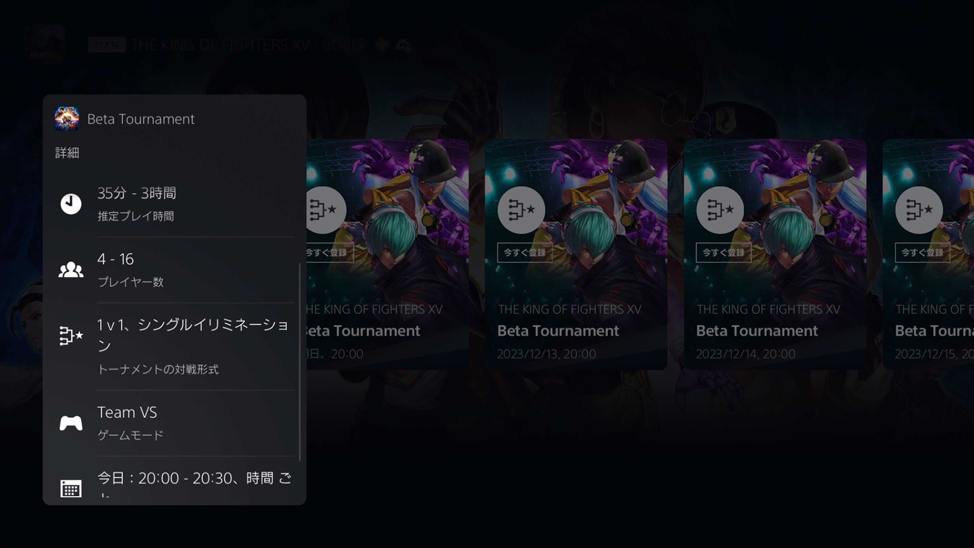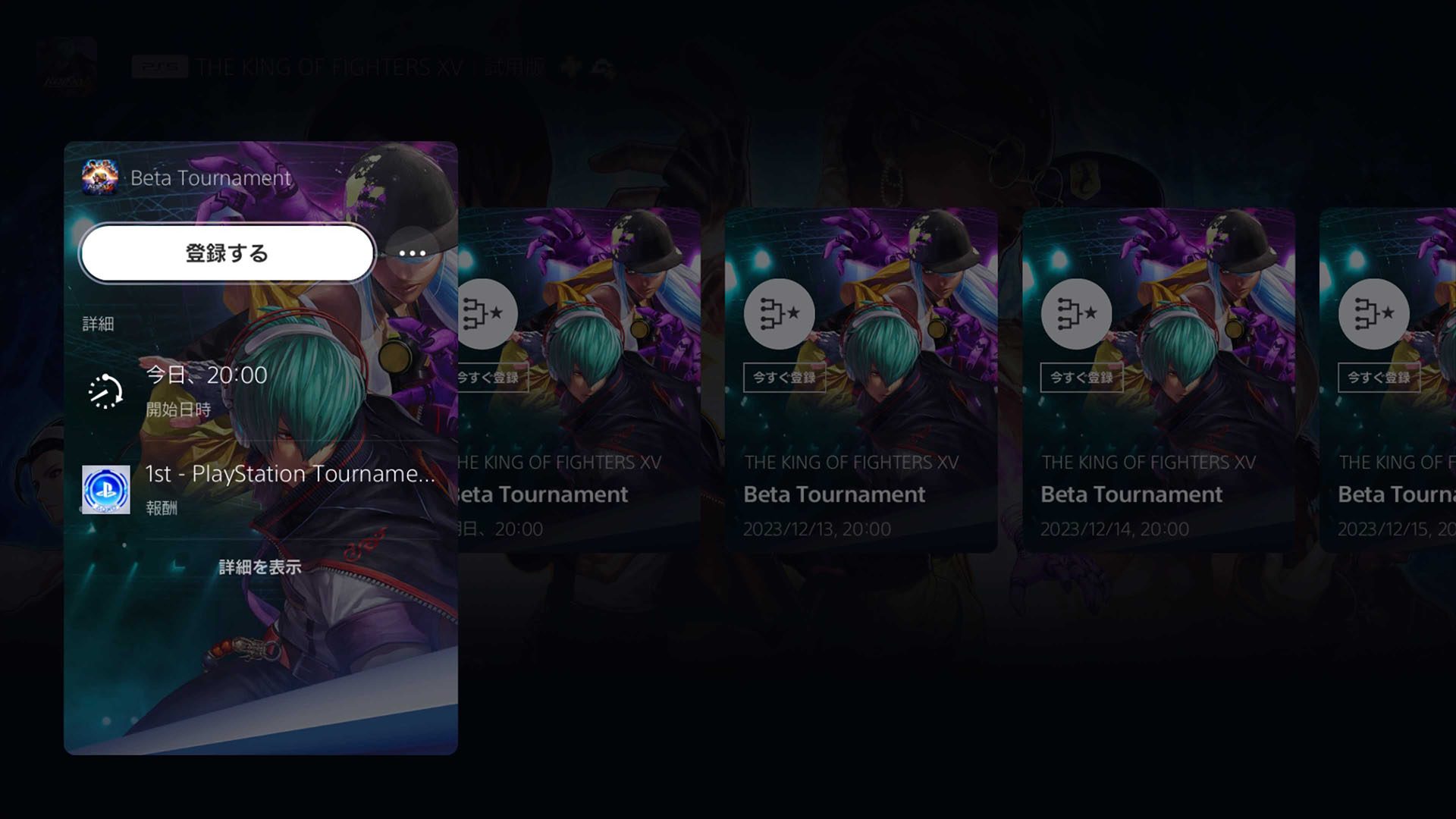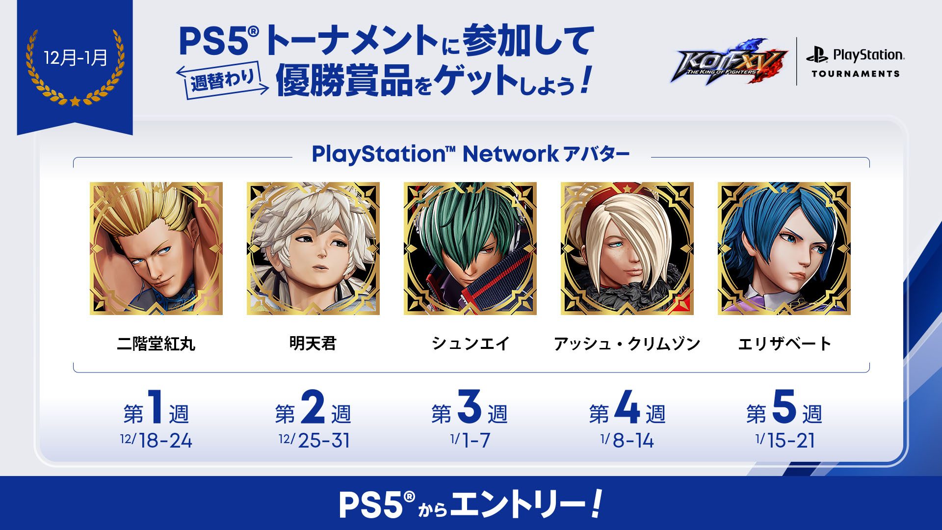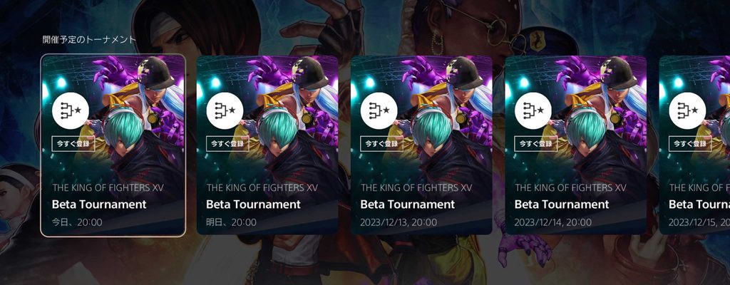 「PS5トーナメント」は、PS5のゲームハブにあるトーナメントカードから特別な情報の入力なく、ワンタッチで参加でき、『THE KING OF FIGHTERS XV』では1日1回、21時から毎日行なわれます(※)。トーナメントには開催時間直前でも参加登録できるため、どなたでも気軽にeスポ―ツへ参加する楽しみを体験できます。また、トーナメントの賞品には週替わりで限定PlayStation™Networkアバターが用意されている(※)ので、推しキャラクターのアバター獲得を目指して、ぜひ大会にご参加ください。