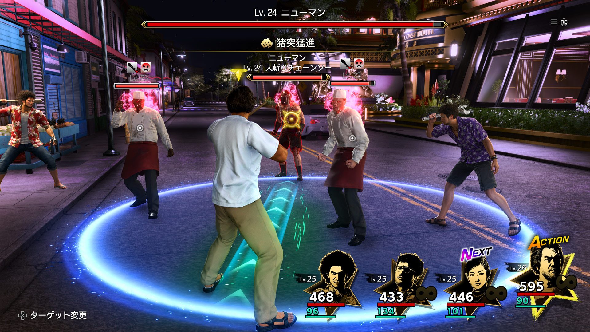 「新ライブコマンドRPGバトル」は、誰もが簡単に楽しめるターン制バトルでありながら、つねに変化する街や人の状況を活用する戦略性と、躍動感あふれるアクション性の高さを兼ね備えた「龍が如く」ならではのバトルシステムだ。本作ではプレイヤーキャラを一定距離内で自由に移動させて戦うことが可能になり、戦術性が大幅に向上している。また、多彩になった範囲攻撃技、進化した吹き飛ばし攻撃やジャストアクション、繰り出しやすくなった連携攻撃など、さまざまな要素が大きく進化。そして、自分たちよりも格段に弱い敵に対しては、一撃で戦いを終わらせることができる「クイックバトル」を選択できるようになった。