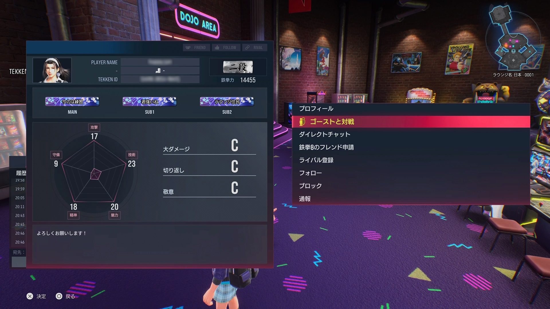 また、他のプレイヤーに近づいて×ボタンを押すとプロフィールを見ることができ、メニュー内の「ゴーストと対戦」を選ぶと、そのプレイヤーのゴーストデータと対戦できる。実際のプレイヤーと戦う前にゴーストデータと対戦し、立ち回りで使用してくる技を覚えたり、対策を練ったりするのもアリだろう。