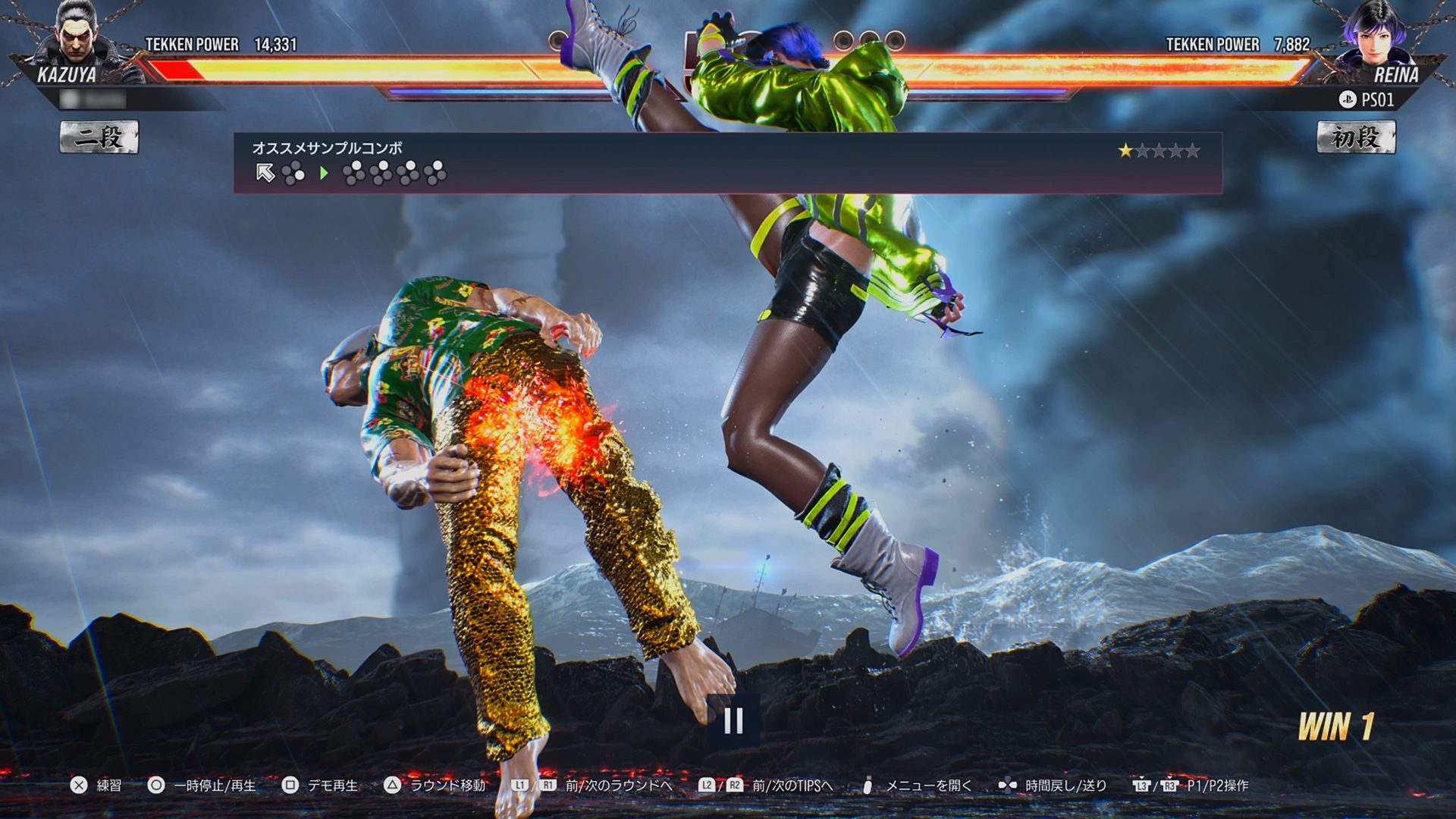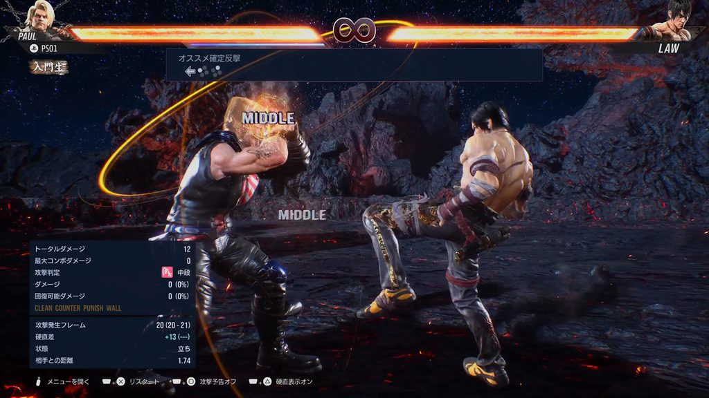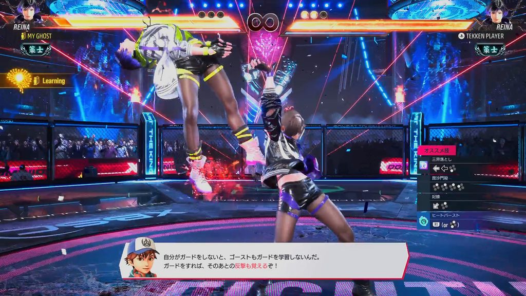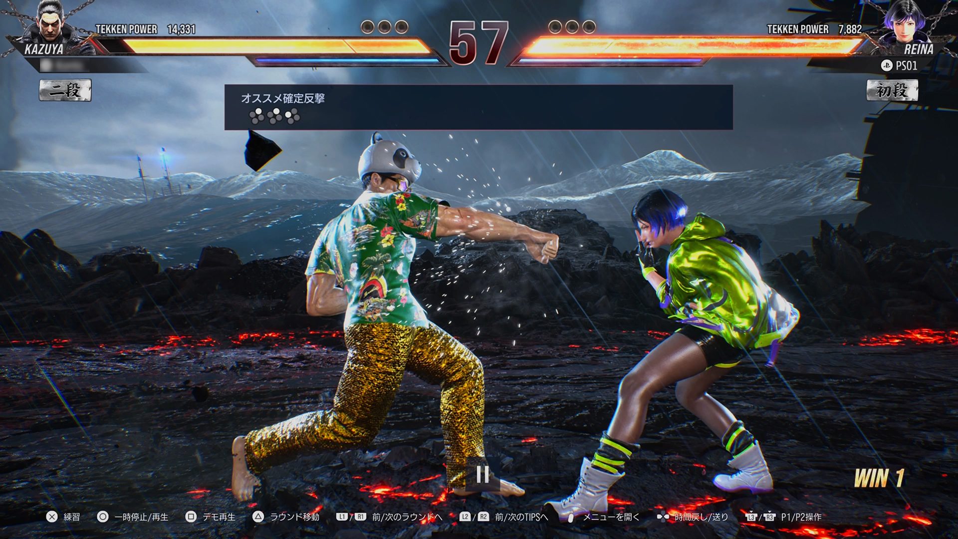 リプレイを見ていると、相手を浮かせた際や相手の攻撃をガードした際に一時停止され、その状況に適したコマンドを表示してくれる。そこから「PRACTICE」へ移行して、空中コンボや反撃技などを練習できる。「相手の隙に確定する反撃技を調べる」というのは中~上級者の発想であり初心者には難しいため、かなりうれしい機能だ。「この技はこれで反撃できたのか!」という発見があり、リプレイを見るのが楽しくなってくる。